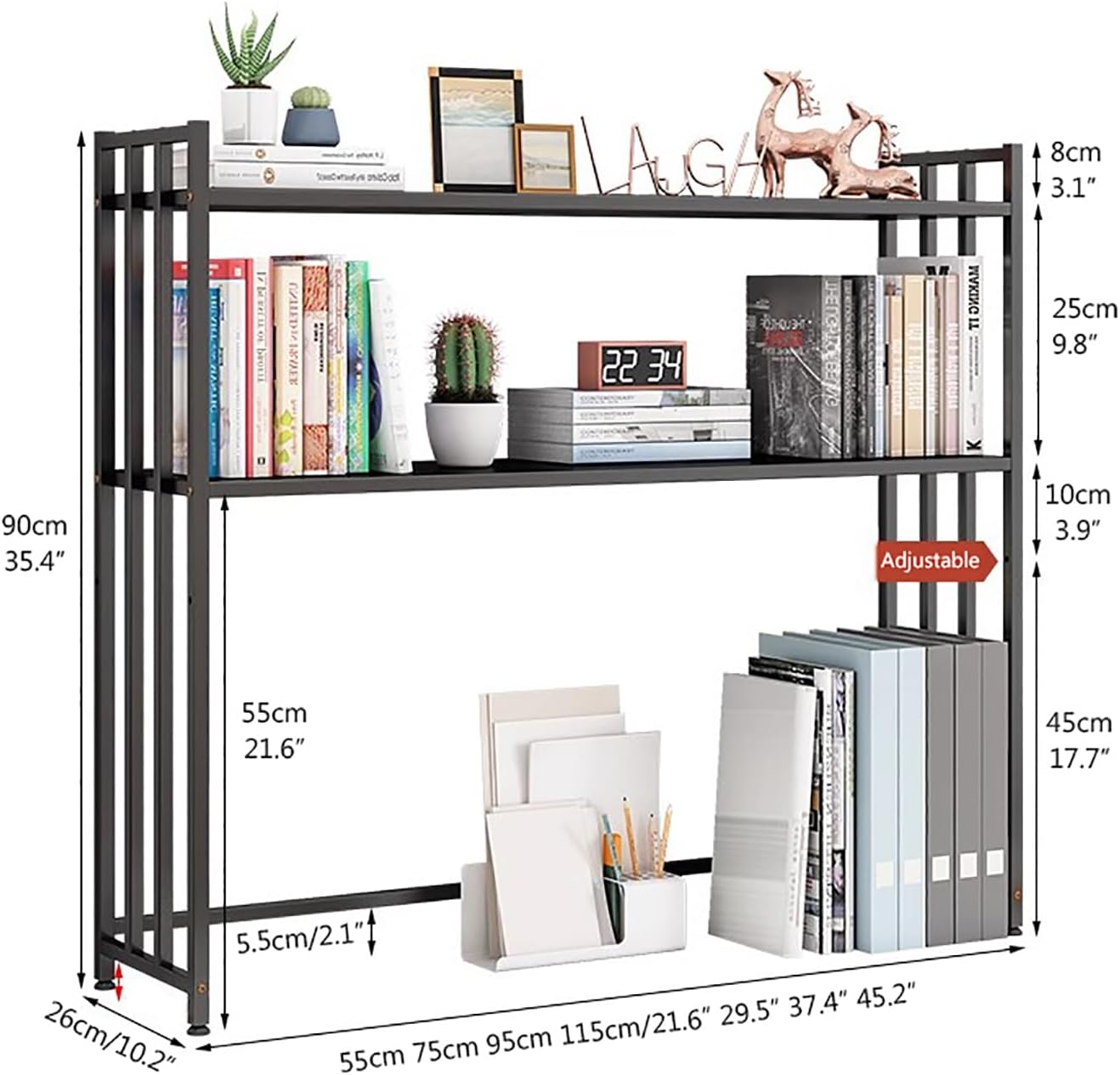 This desktop bookshelf features a 2-tier shelf design that maximizes vertical space to provide ample storage space, so you can keep your items neatly organized and within reach;