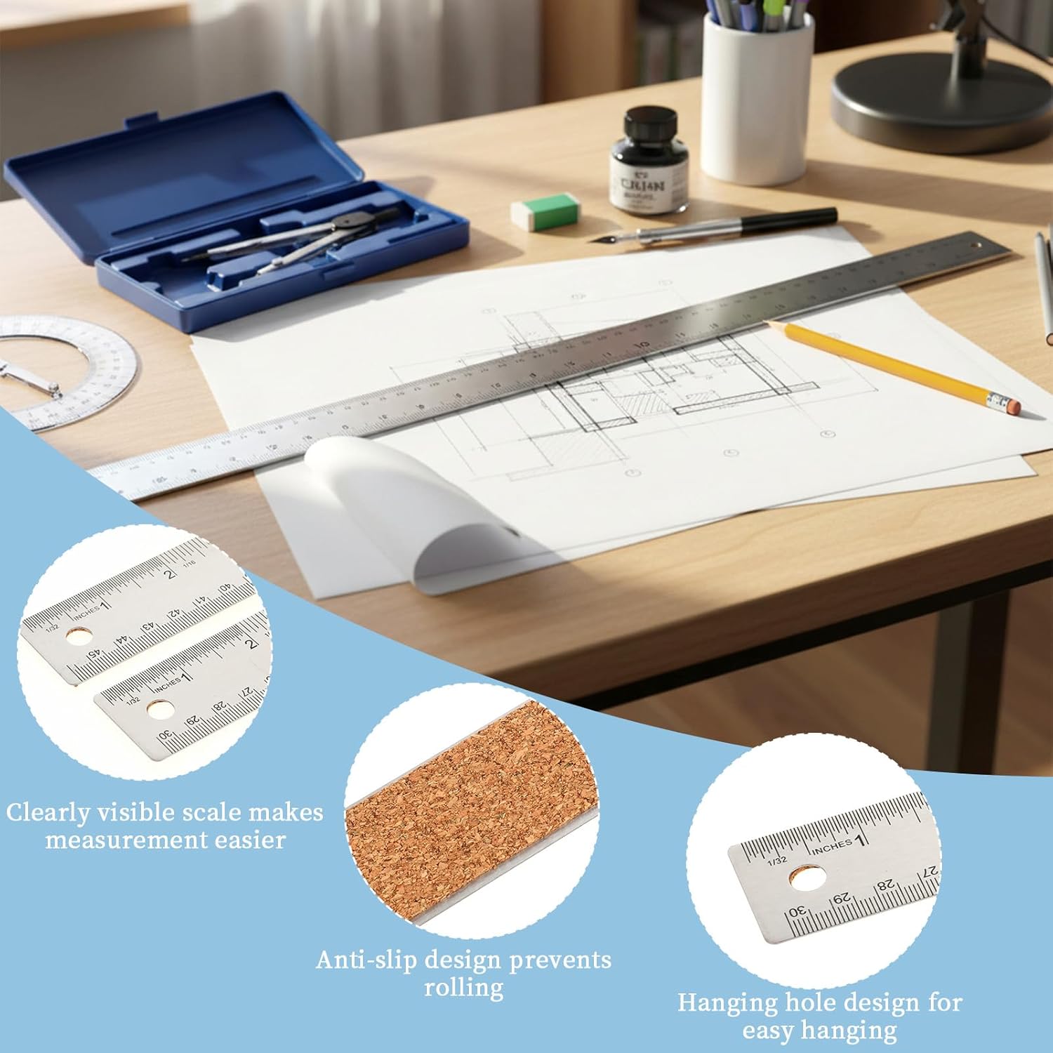 Metal Ruler 18 Inch – Stainless Steel Metal Ruler with Cork Backing Non-Slip Rulers with Inch and Centimeters Prevent Ink Leakage for School Office Drawing Engineering Tools