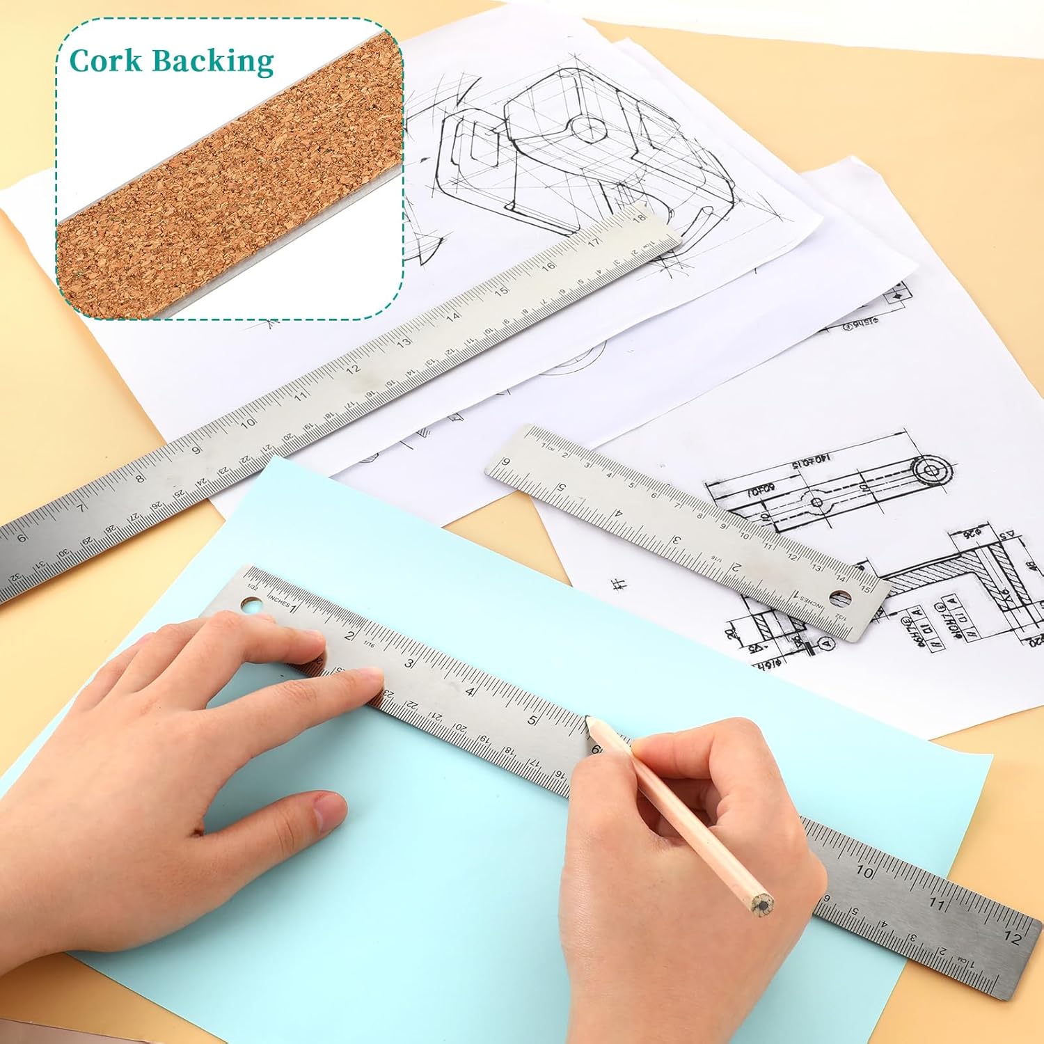 Durable, High-Quality Construction: Crafted from premium stainless steel with cork backing, these non-slip rulers with inches and centimeters are built to last. They resist rust, corrosion, bending, and warping, ensuring long-term reliability and structural integrity.