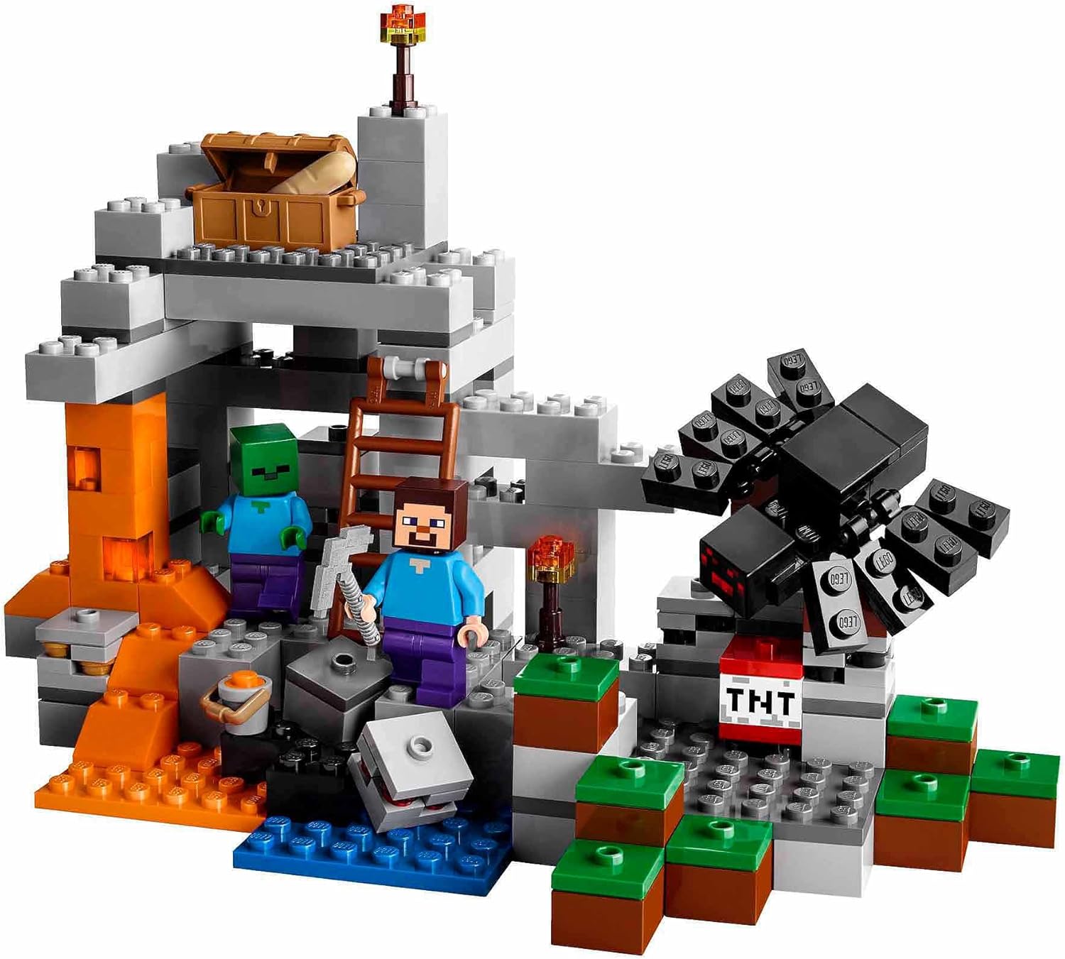 Venture into The Cave on a dangerous quest for vital resources! Wield the iron pickaxe to dig and battle against hostile zombie and spider mobs. Blast out valuable ores and minerals with the TNT and combine the flowing water and lava to create precious obsidian! When you’re done battling and mining, restore your energy levels with the chest of bread. Proceed with caution! Rebuild the set for more LEGO Minecraft creations! Includes 2 Minecraft minifigures with assorted accessories: Steve and a zombie, plus a spider.