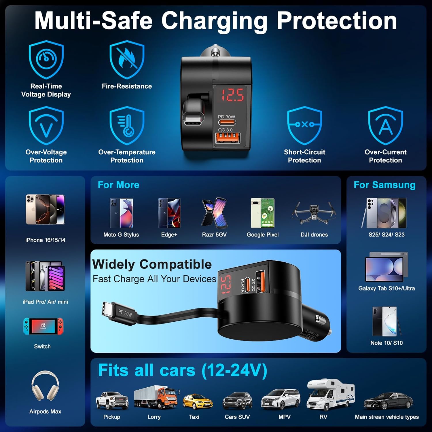 【Upgraded 3-in-1 Fast Charging Retractable Car Charger】 This retractable usb c car charger comes with a retractable cord and 2 charging ports( USB A+ USB C),enable you to charge up to 3 devices simultaneously.The PD 30W Type-C retractable cable is ideal for fast charging iPhone 16/15 series/Samsung S25/S24/S23 series.The additional PD 30W USB-C port and QC3.0 18W USB-A port can fast charge all prevailing phones and E-devices.No need for multiple chargers, just one car charger for all your charging needs.