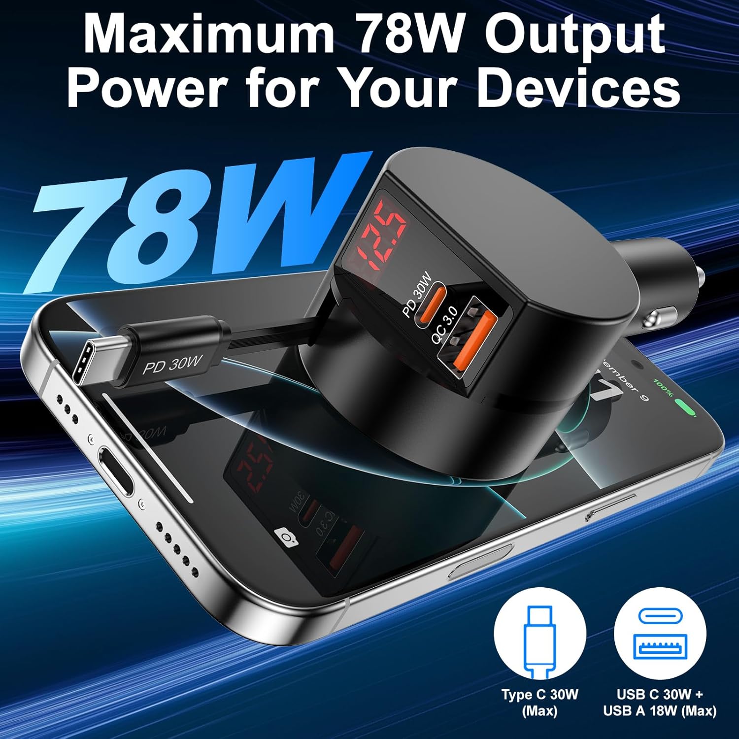 【30W Type C &30W PD & QC 3.0 Fast Charging】This 78W Retractable Car Charger with 30W Type C car charger cord is equipped with PD3.0 & QC3.0 to offer super-fast charging.The USB QC3.0 output(18W Max) for cellphones, sports watches, car recorders, cameras, and other USB-powered devices;and USB C PD3.0 output(30W Max) for iPads, MacBooks, Game consoles, Smartphones, and other USBC-enabled devices.The 3 port car charger supports 3 devices charging at once, meeting most of the car’s charging needs.