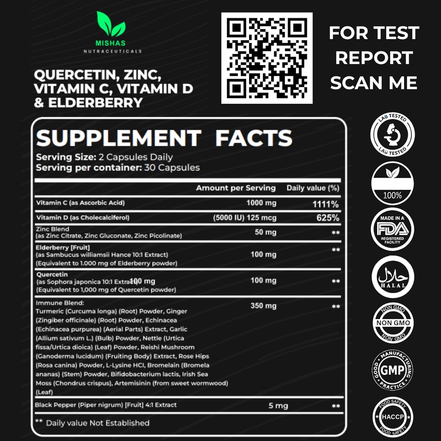 Mishas Strength Quercetin with Bromelain, Zinc, Vitamin C & D, Elderberry – Immune & Lung Support Supplement for Women & Men – Artemisinin, Sea Moss, Echinacea & Allergy Relief – Vegan 60 Capsules