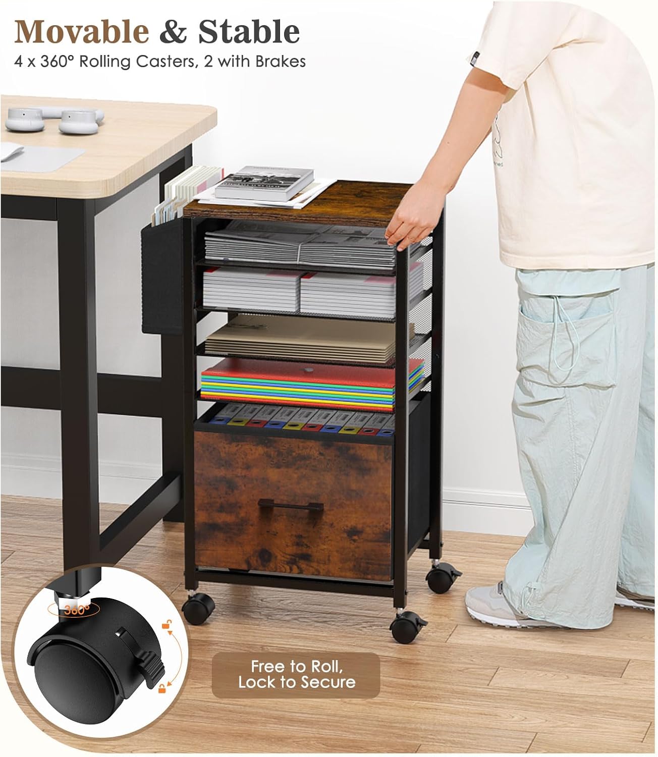 The file organizer comes with 4×360° rolling casters, easy to move anywhere. 2 of them have brakes to lock and fix.