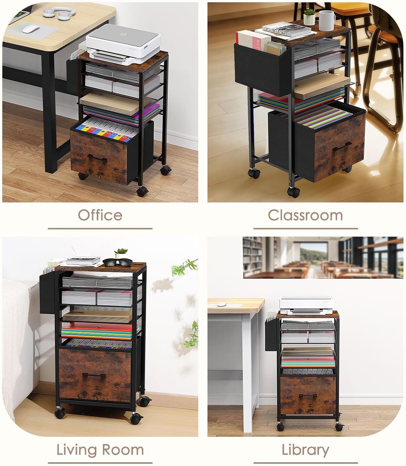 Multi-purpose Organisation Cart: The Storage cart has 4 wheels free to roll and lock to secure which easy to moving and fixed used. The wood tabletop provide a space for printer, crushing machine. The rolling cart perfect for school teaching plans keeping, office worksheets file folder keeping and as a home file cabinets for newspaper and magazines storage.