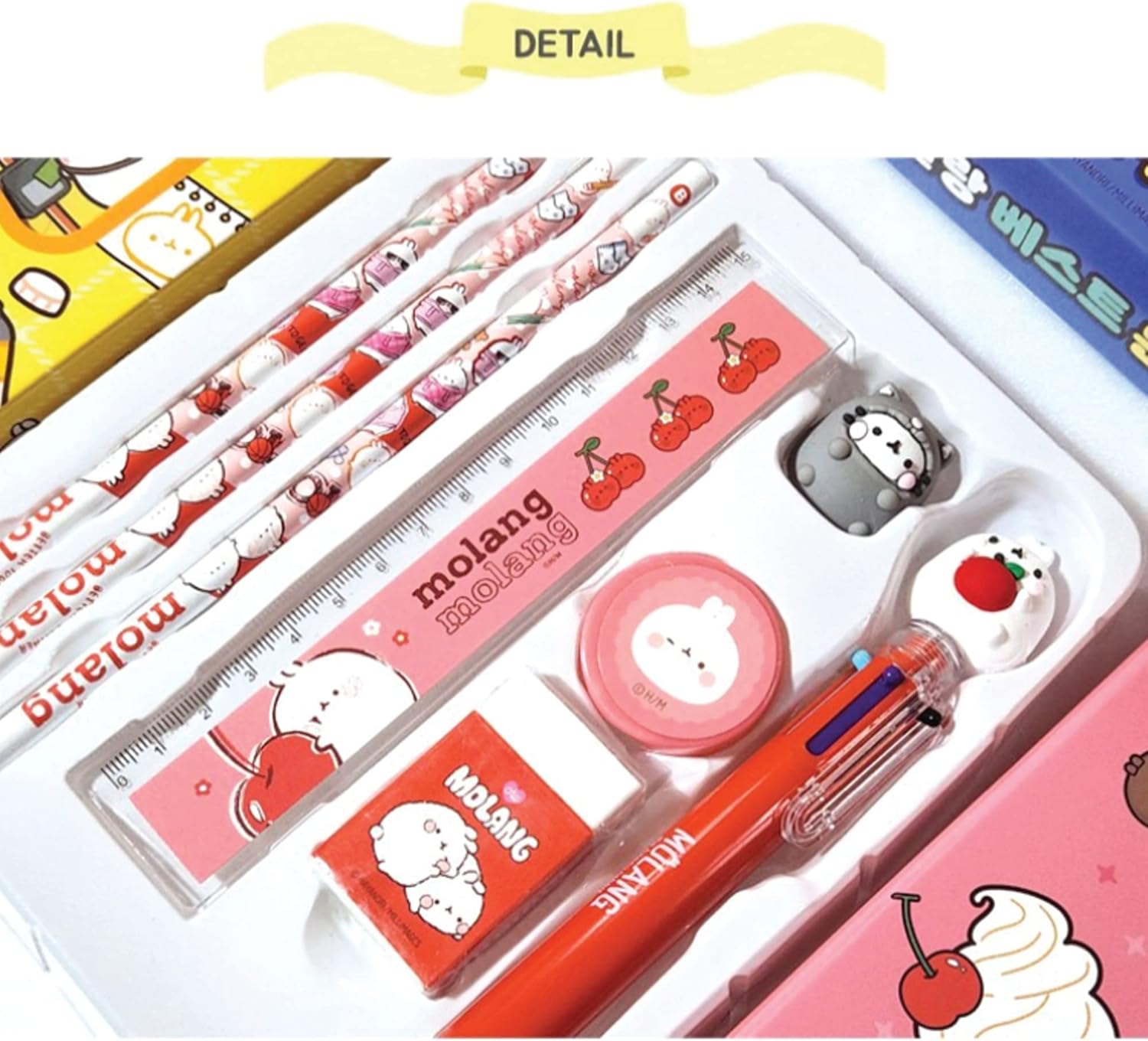 Molang Best School Stationery Set – Kawaii Korean Kit (Pencil 3pcs, Eraser, Sharpener, Case, 6-Color Ballpoint Pen, Figure, Ruler) – Complete Supplies for Students, Office, Art, Writing