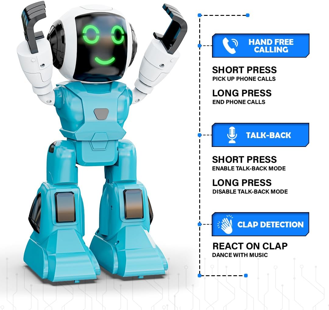 🎵 Bluetooth Speaker, Clap Detection & More: Enjoy music, talk-back functions, Hands-Free Calling, and unique Clap Detection that makes the robot dance with music and respond to sound cues in real time.