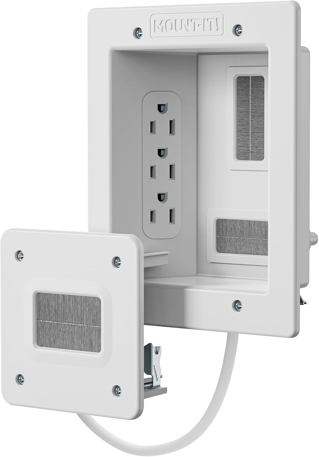 Make sure it fits: This 2-piece cable management kit includes a large plate (6.3″ x 7.9″) and a smaller plate (4.5″ square). Installation requires cutting a hole in your drywall between studs to fit both plates—don’t worry, a drywall saw is included. Confirm your space before ordering to ensure proper installation.
