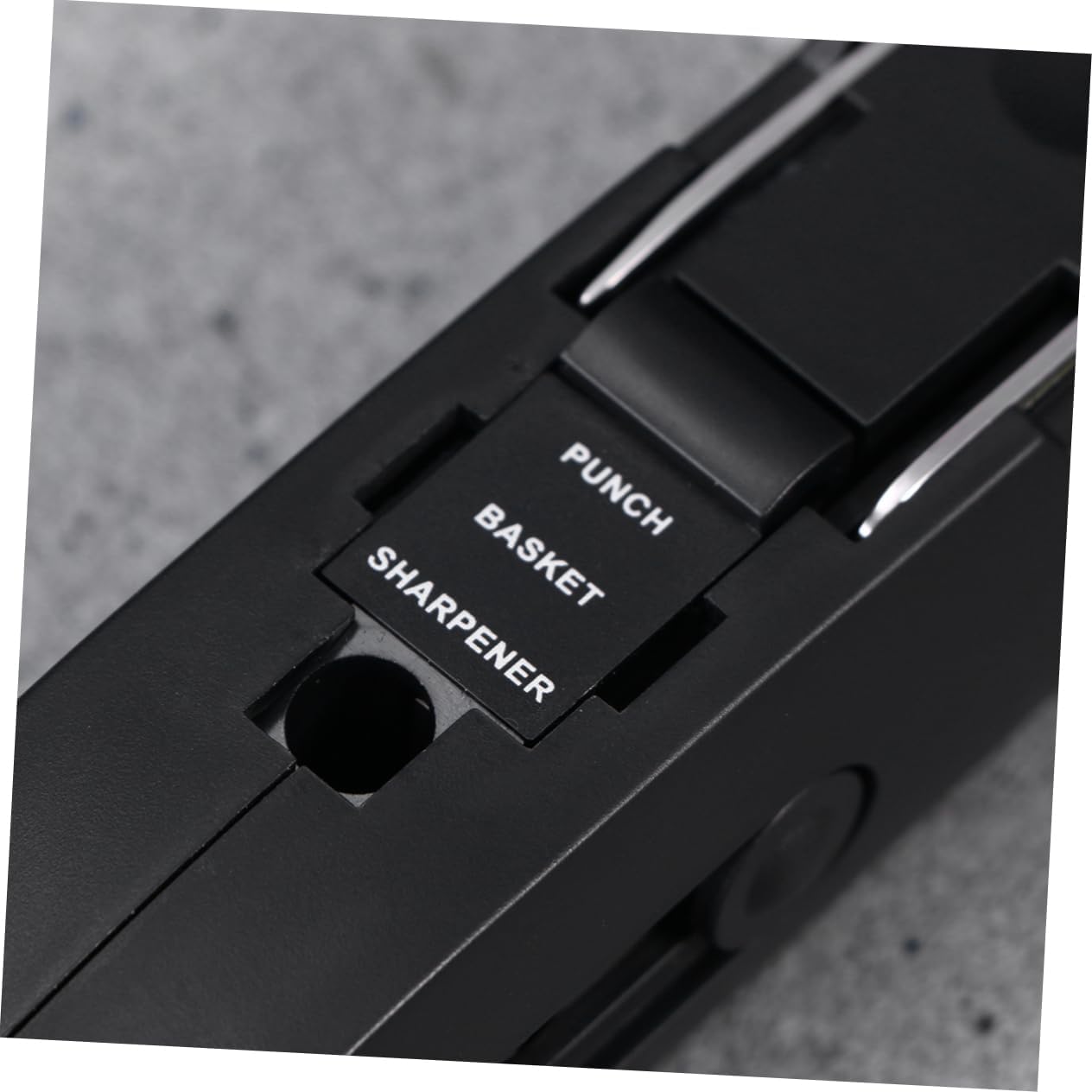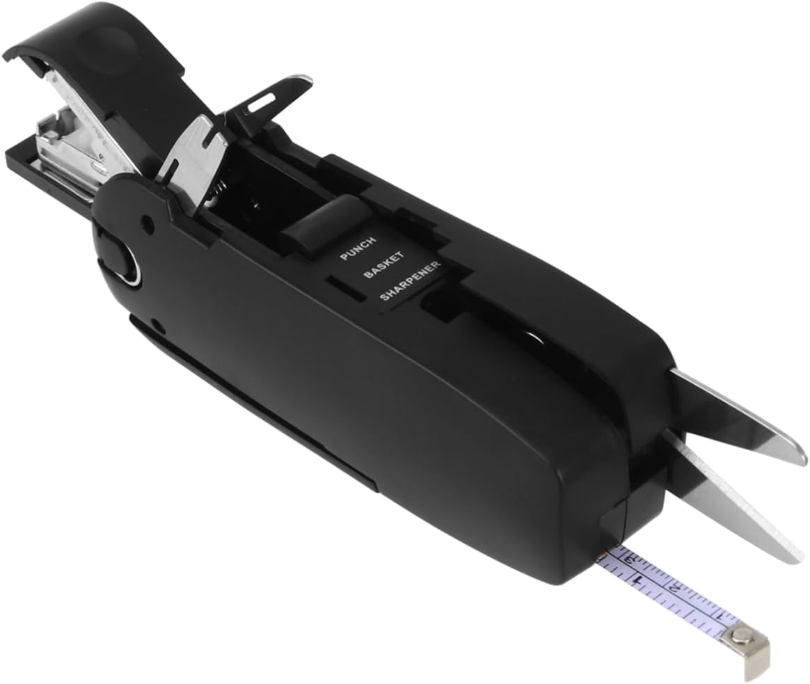 Sharpener black:featuring 10 mini tools, it is a true multifunctional tool scissor, flexible rule, pencil sharpener, stapler, cutter, screwdriver, puncher, nail puller,small storage box and hook,small