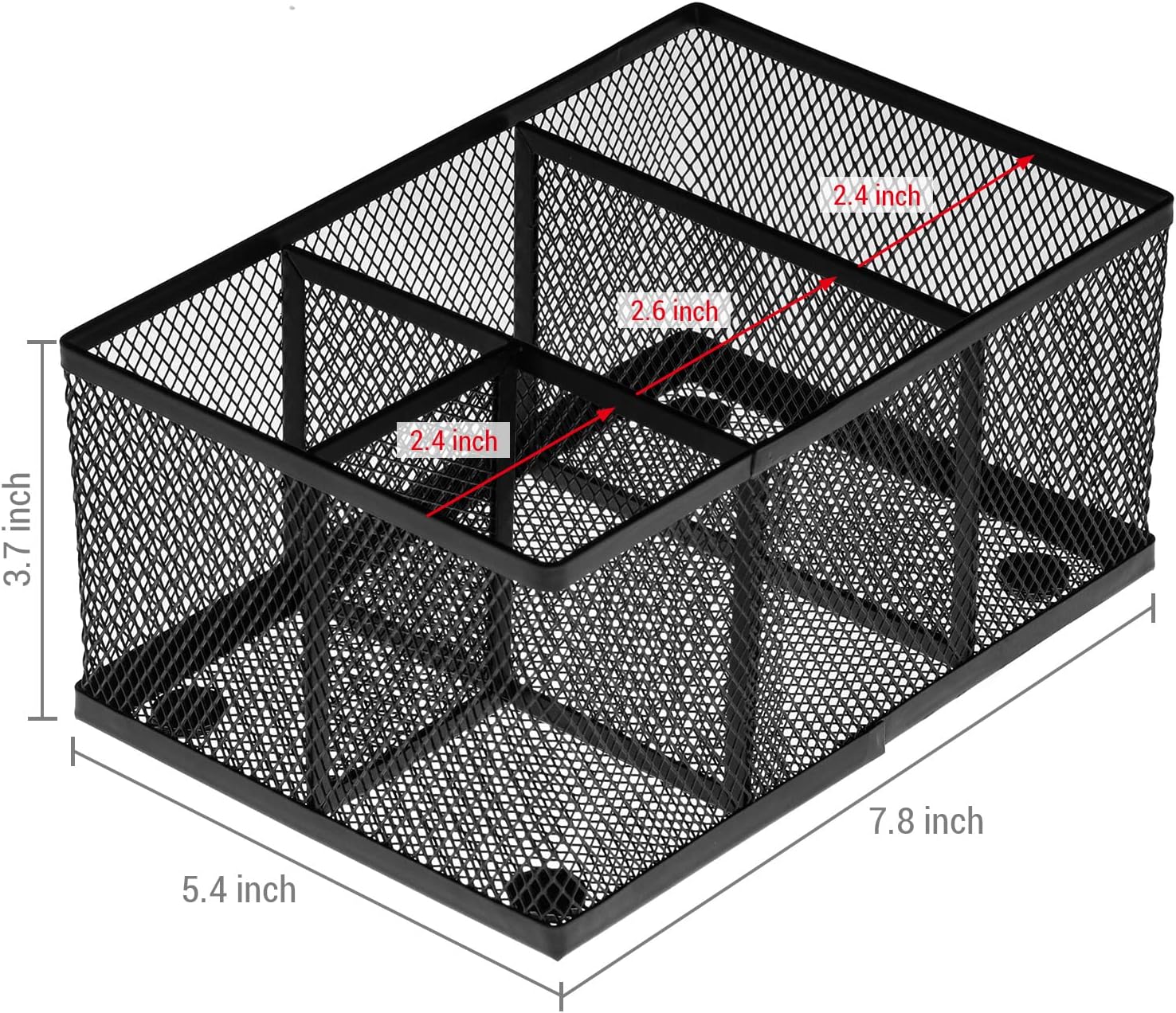 Overall – 4.75 H x 4.0 W x 4.0 D; Wire Panels – 3.5 H x 3.0 W (in inches) 4.0 H x 4.0 W x 4.0 D (in inches) Overall – 4.75 W X 5.25 H X 2.5 D; Pencil Holder – 3 H X 2.25 D 5.8 H × 5.5 W × 10.5 L Overall – 16.0 W x 0.9 D x 2.8 H (in inches) Each Basket – 3.5 W x 3.0 D x 5.0 H (in inches)