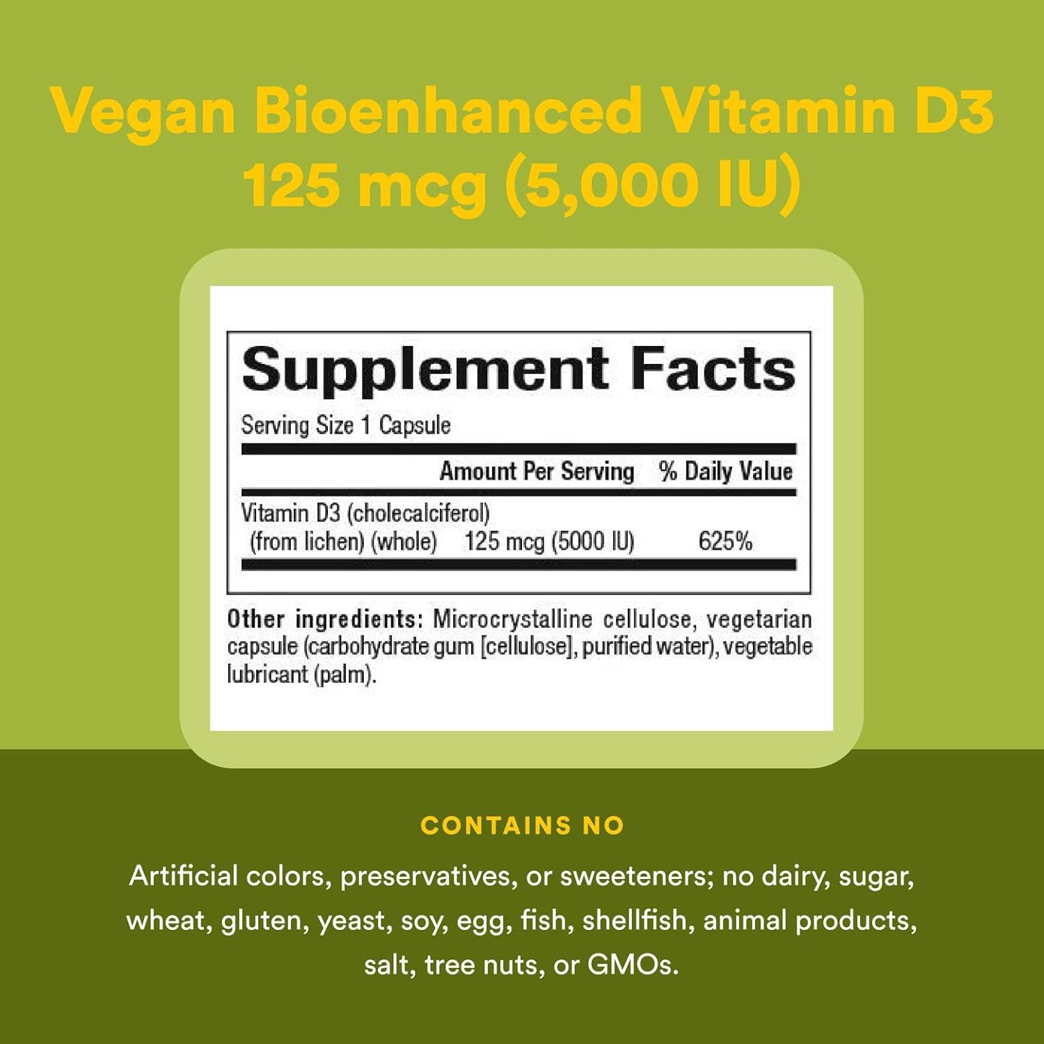 Vitamin sunshine: Formulated to support healthy bone development and immune system health; An excellent source of 5000 IU (125 mcg) vegan friendly vitamin D3