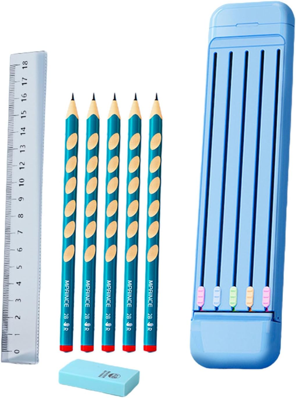 KIDS STATIONERY GIFT SET. The for Multifunctional pencil ruler eraser stationery set includes 5 X HB pencils; 1 x 2B Rubber Eraser; 1 x Plastic Ruler; 1 X Pencil for Case. An for ideal back to school gift for kids, boys, girls, toddlers.