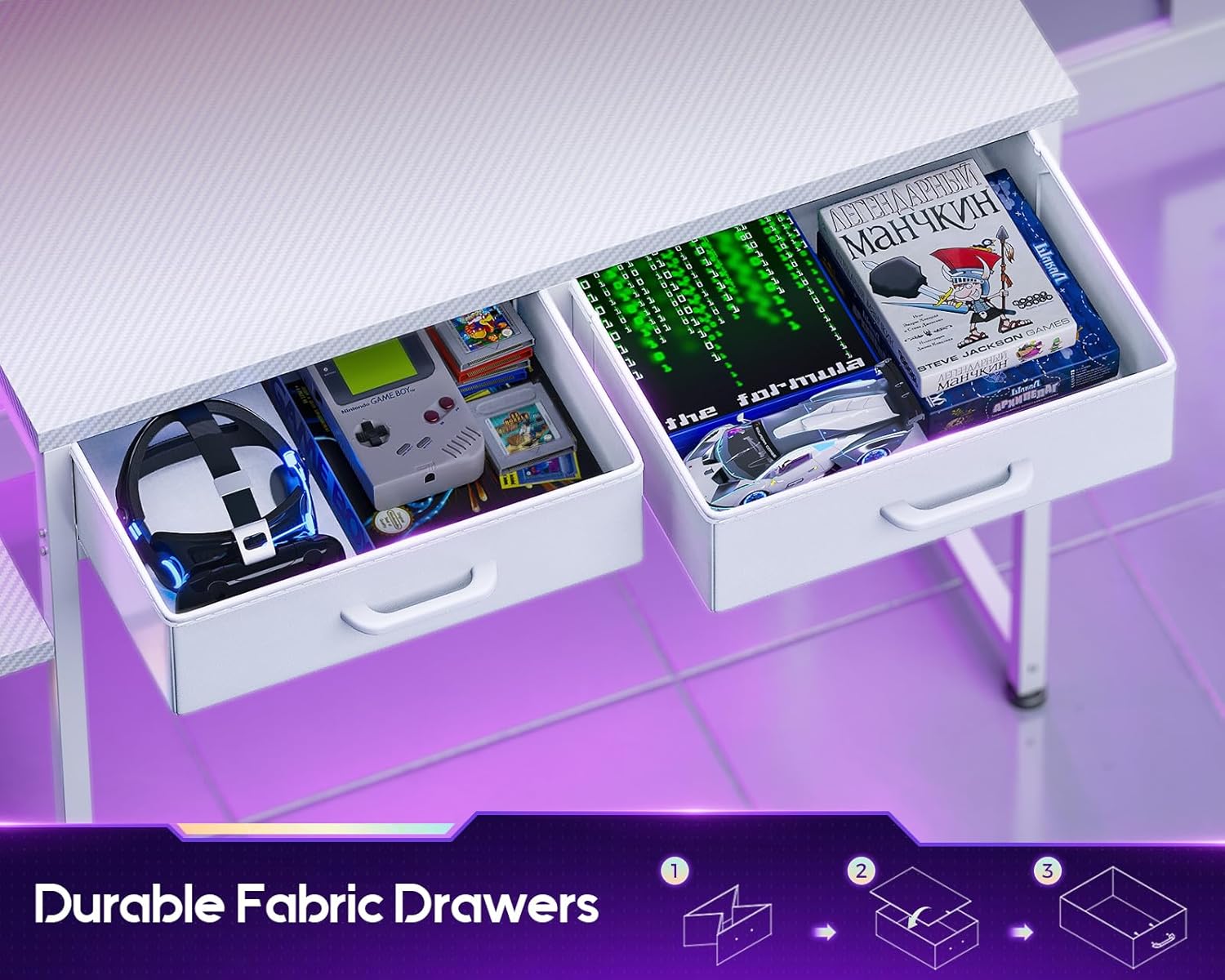 【Computer Desk with Drawers】There are 2 fabric drawers that are easy to pull and push. These drawers provide ample storage space to neatly store small entertainment items such as CDs, gamepads, etc., keeping your gaming space tidy and efficient.