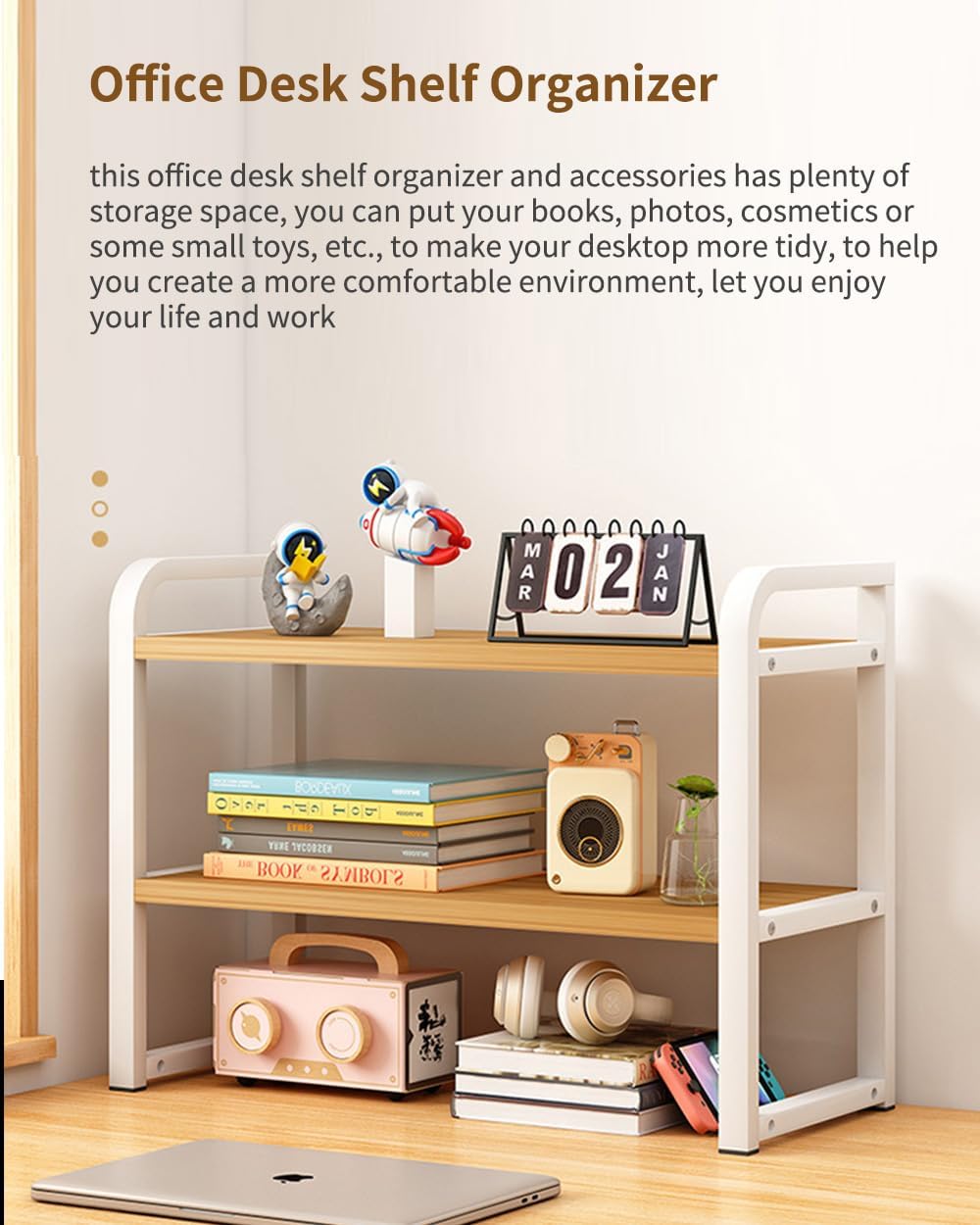 【Great Decoration at Home/office】Our desk shelf can be used upside down, maximizing its functionality to meet your needs. Two-layer shelf offers spacious storage space for office supplies, books, monitors, spice vases, plants, etc.