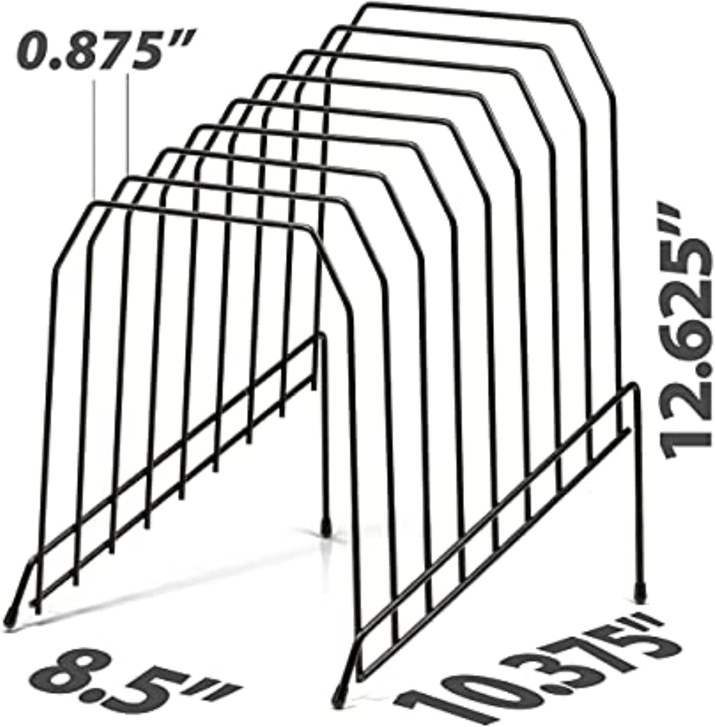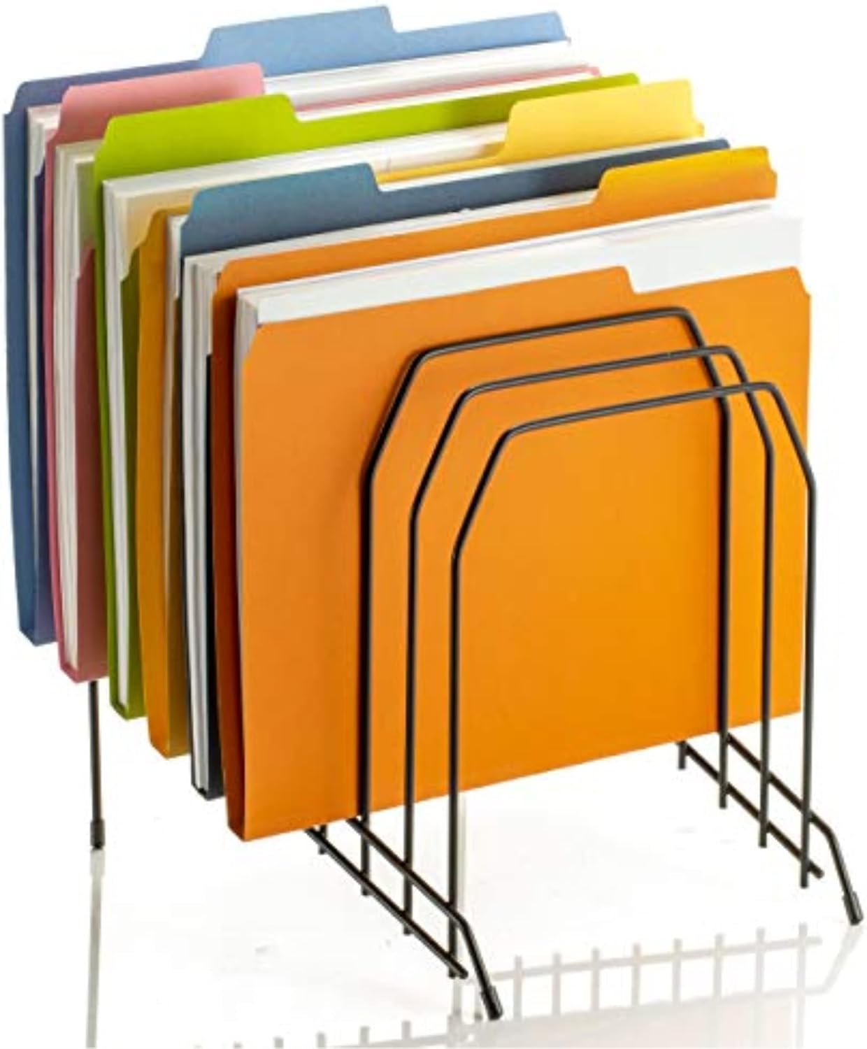 Large incline sorter helps organize your work place. Modern open design provides easy access to papers. Perfect for file folders. Eight wide compartments to hold letter and legal size documents and folders. Made from heavy duty wire construction. The incline sorter keeps documents and file folders visible and easy accessible. Protective feet will help limit the scratches on the desktop. Comes in Black.