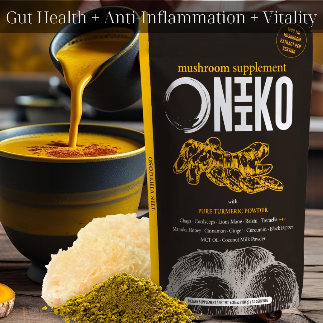 Oniiko Mushroom Turmeric Latte with Curcumin, Ginger, Manuka and Coconut for Gut Health, Vitality and Anti Inflammation, 1500 mg Extract per Serving, 1 Month Supply