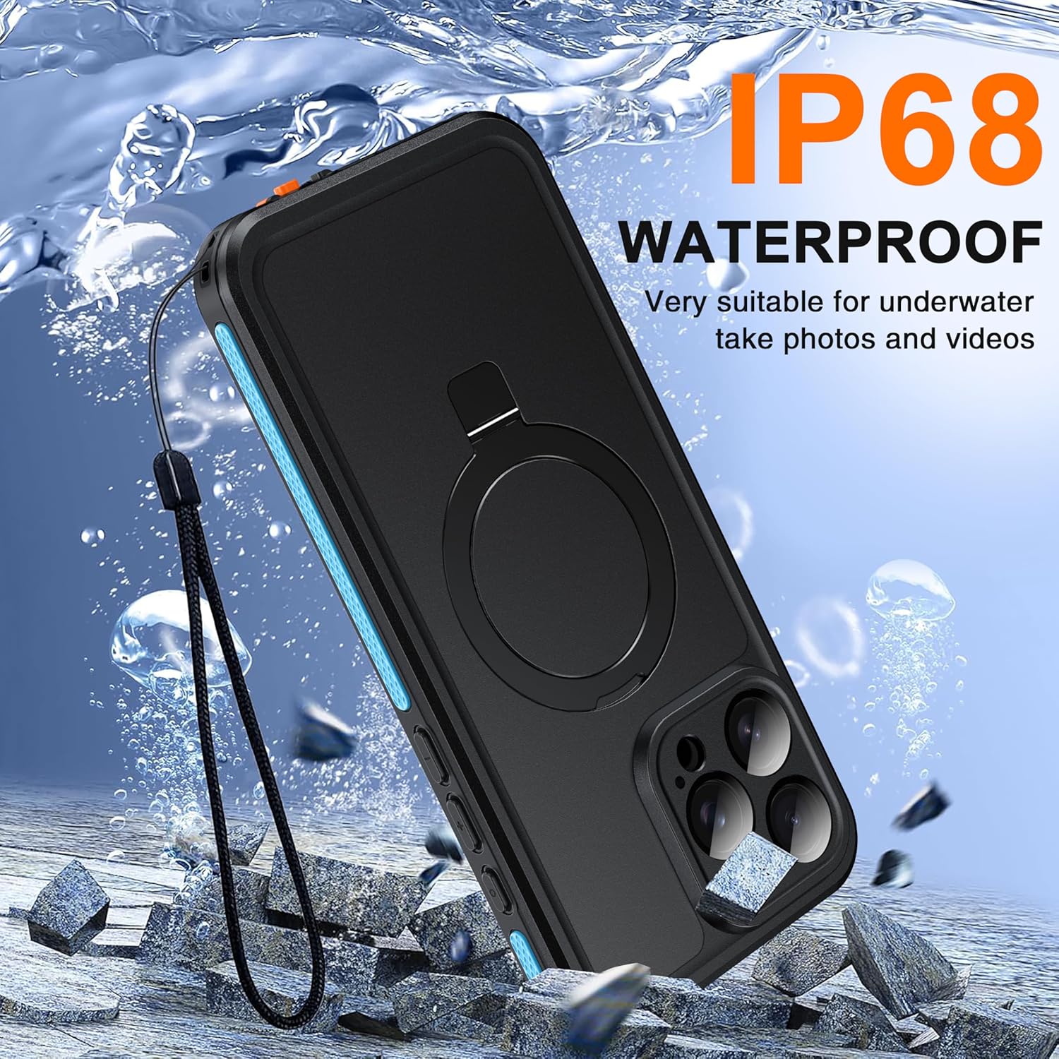 Oterkin Magnetic Waterproof for iPhone 15 Pro Max Case with [Built-in Screen Protector][Invisible Stand][Fit for MagSafe][360º Full Body Sealed] Rugged IP68 Underwater Case for iPhone 15 Pro Max-Blue