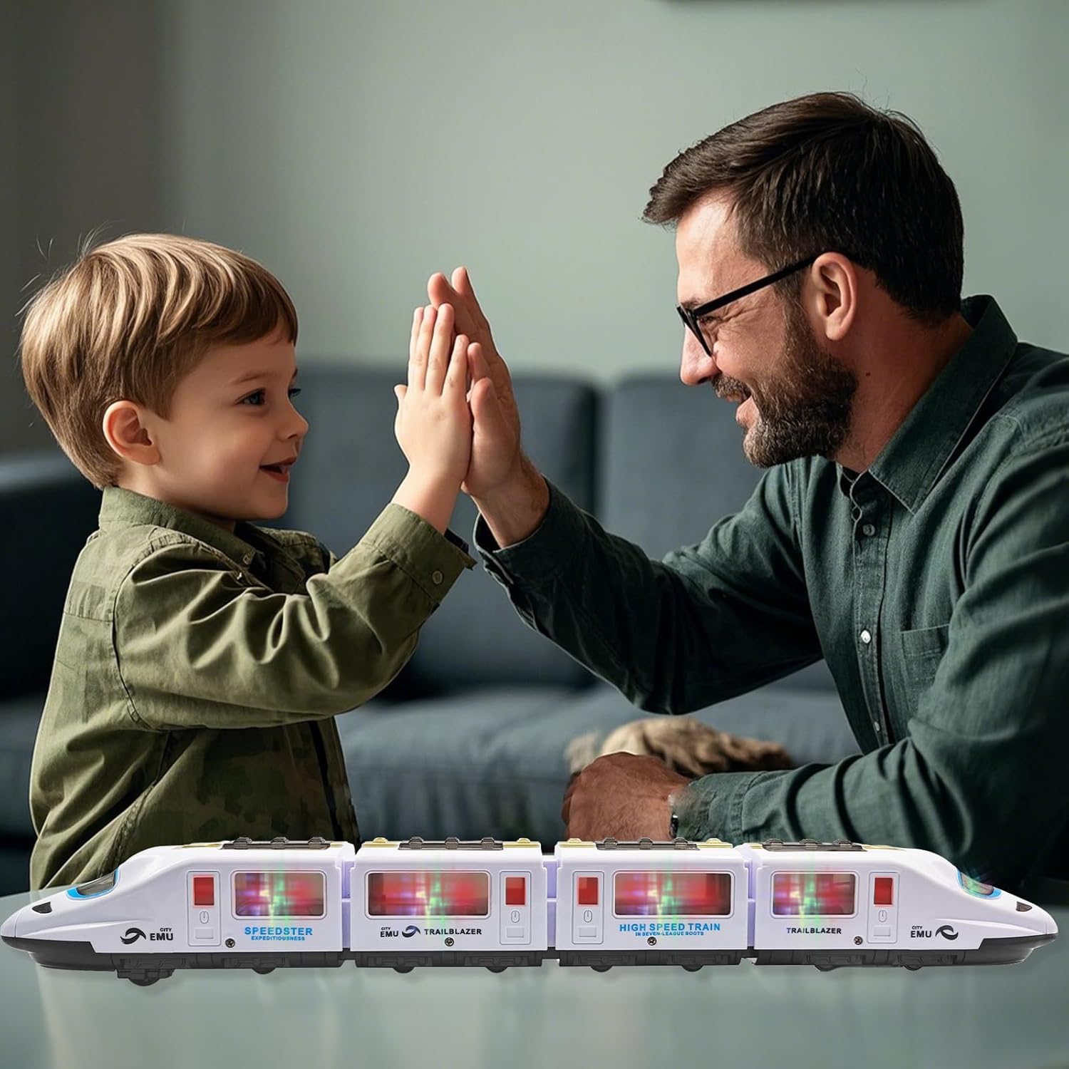 3D Lightning Classic Train Car Toy -:When you push the button, the whole body of the high-speed train will emit a beautiful and dazzling light. The sound effect of the monorail train has the sound of the high-speed train roaring and passing through, which is very realistic. It can let children experience the ultimate real high-speed train scene without leaving home, and immerse themselves in the fun of riding the high-speed train.