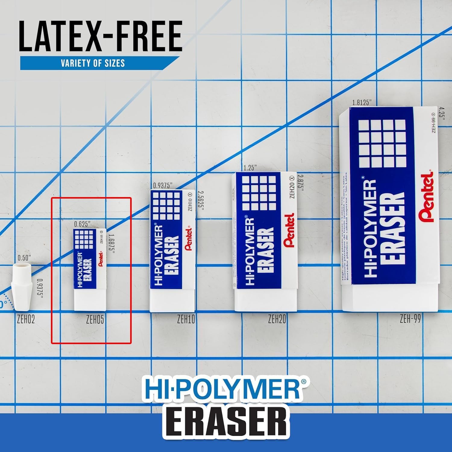 Pentel Hi Polymer Eraser Pack- Includes 18 non-abrasive, latex-free small block-style erasers in a protective sleeve. Perfect for school, art, and engineering use with no smudges, paper tears, or ghosting, ensuring clean erasures every time.