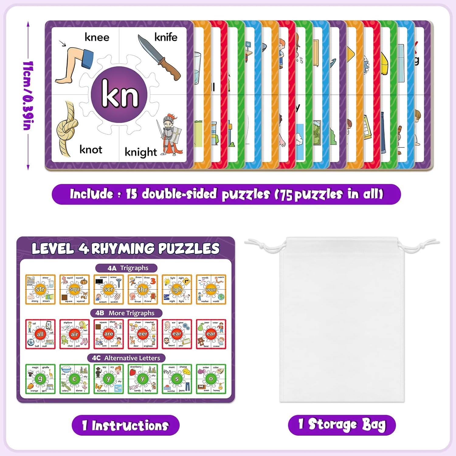 Contents: It is divided into 4 levels according to the teaching content: Level 1: Short Vowel Blends; Level 2: Consonant Blends & Digraphs; Level 3: Long Vowels, Silent E, Bossy R, and Diphthongs; Level 4: Trigraphs, Alternative Letters, Common Endings, and Silent Letters. This rhyming puzzle set is great for young children learning basic words and pronunciation.