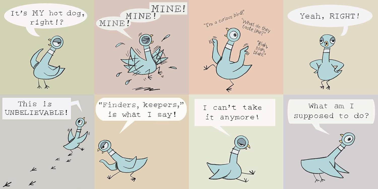 When Pigeon finds a delicious hot dog, he can hardly wait to shove the entire thing in his beak. But . . . then a very sly and hungry duckling enters the scene and wants a bite. Who will be the more clever bird?