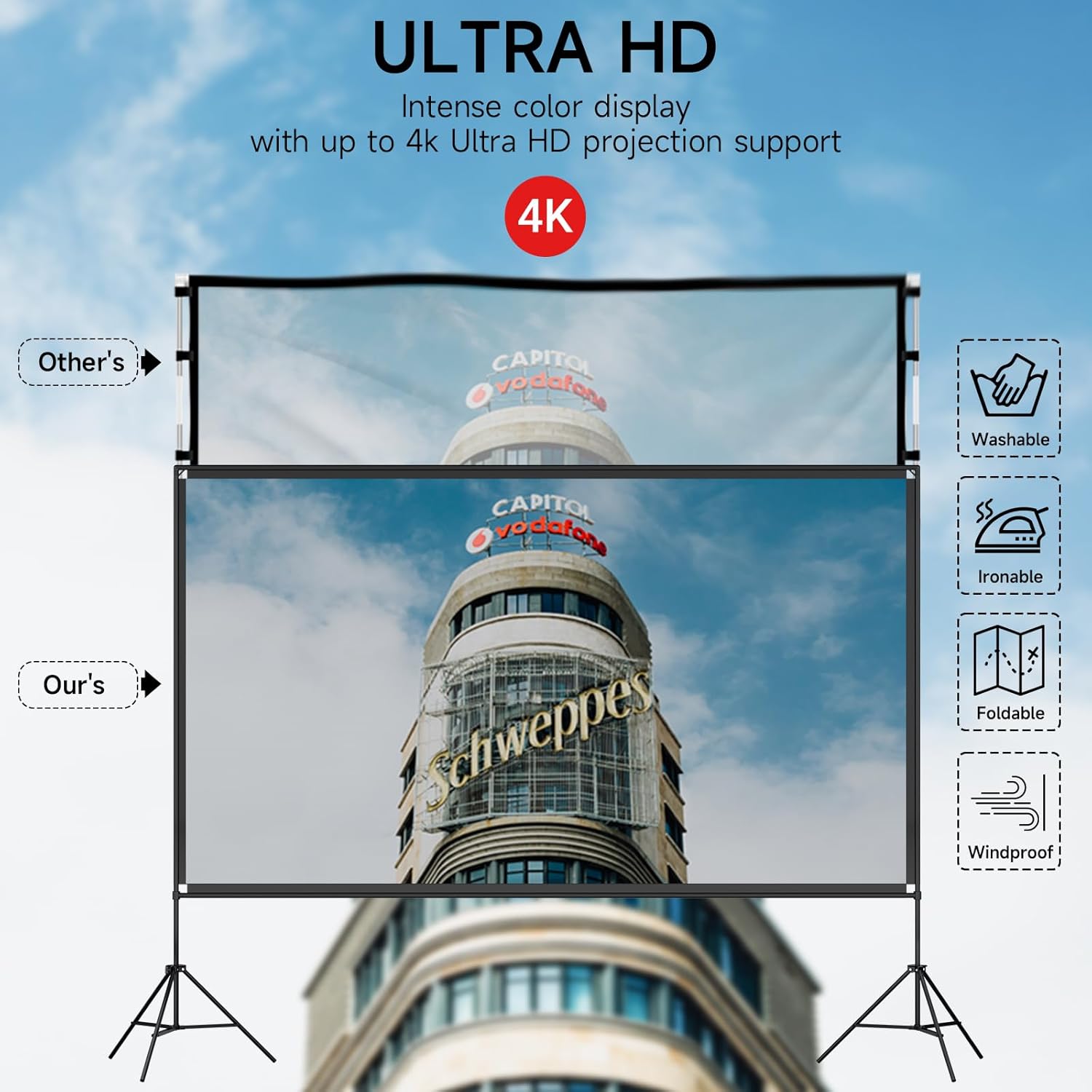 【Premium Outdoor Projection】 Our projector screen with stand supports 4K Ultra HD resolution projection, delivering stunningly sharp and colorful visuals. The 16:9 aspect ratio creates a grand cinematic experience, perfect for watching epic movies, and live concerts outdoors.