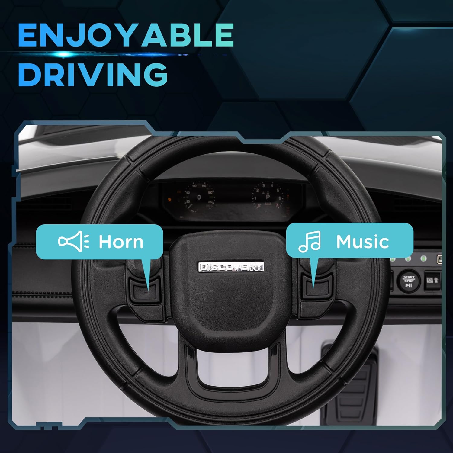 Officially Licensed Design: This 12V Land Rover Discovery Sport themed electric car for kids is crafted to replicate an iconic design, complete with headlights, tail lights, a horn, and built-in music for a realistic driving experience.