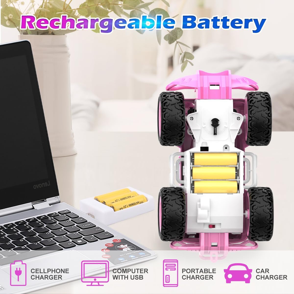 [Easy to Control] With 4 channels: move forward, backward, turn left, turn right, 360°rotation (operate forward/backward+turn left/right at the same time), the toy car is easy for girls age 3 4+ to operate. Kids can play the toy truck indoor, outdoor, travel.