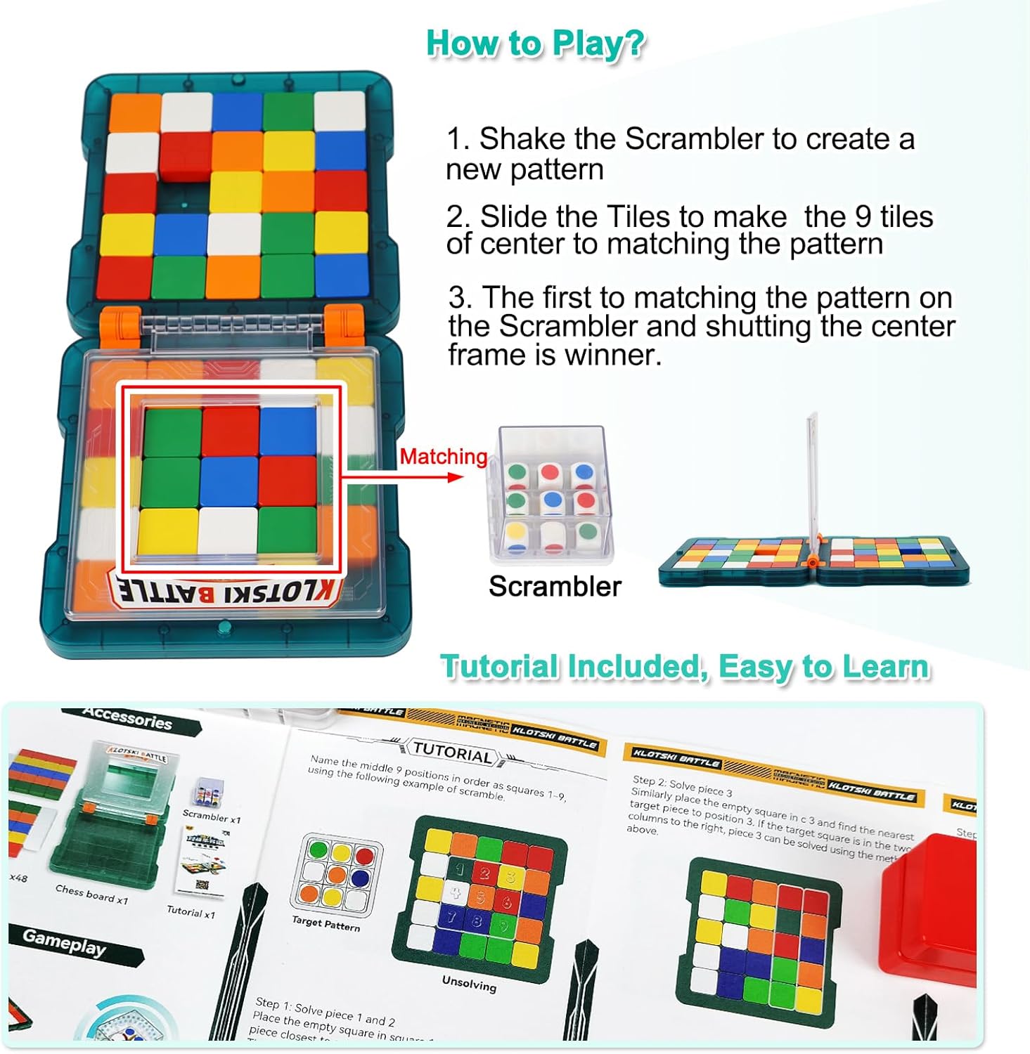 Shake,Slide and Solve: Shake the Scrambler to create a new pattern, battle head to head with your opponent; Slide the tiles quickly to make the 9 tiles of center to matching the scrambler’s pattern. Matching complete, be the first to shutting the center frame to win.