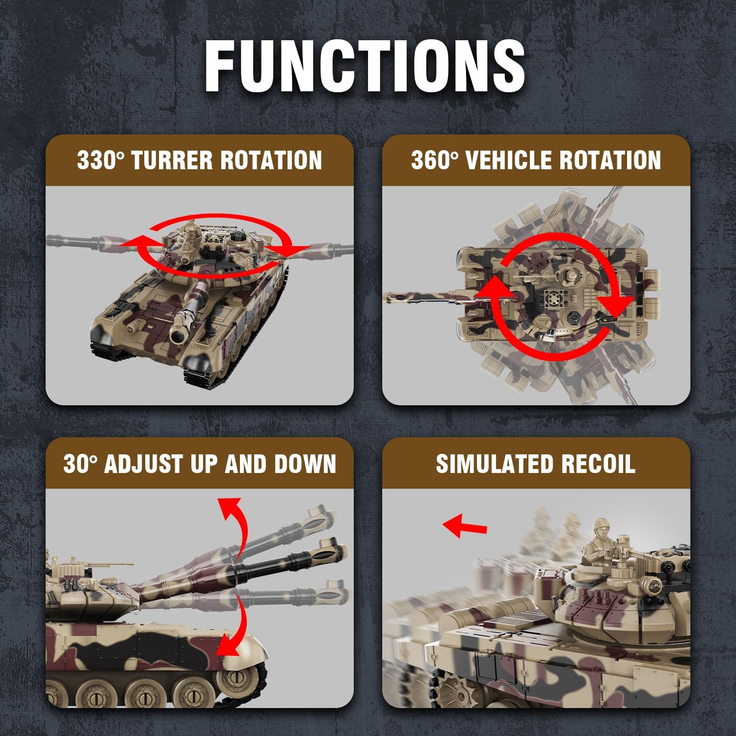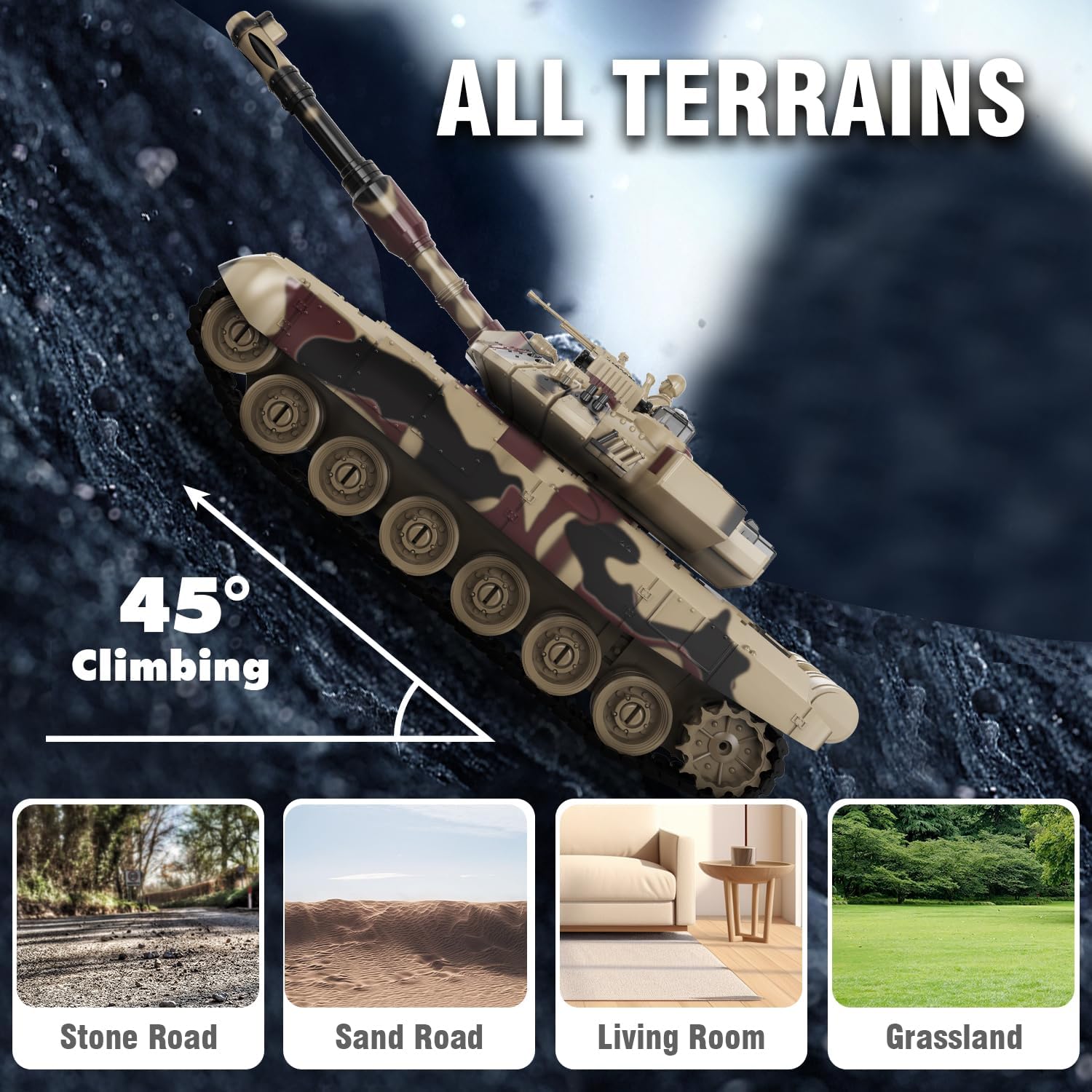 Full Functionality: Remote control tank can move forward/backward, rotate 360°, and the turret spins 330° with a 30° manual adjustment. Capable of climbing slopes up to 45 degrees and rolling over small obstacles. Equipped with a unique one-button sweep function