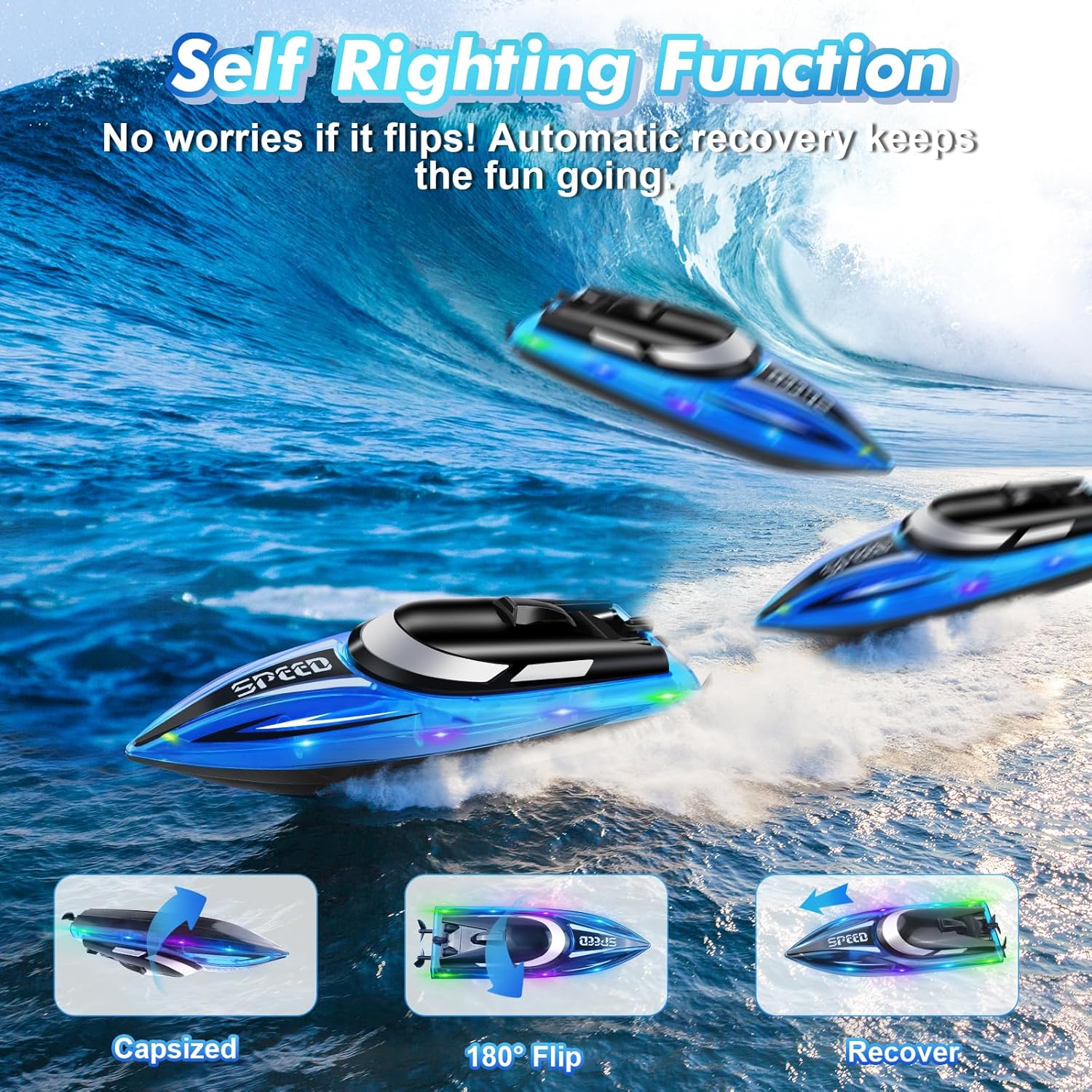 DAZZLING LIGHTS: Experience the thrill of night racing with our remote control boat for kids featuring dazzling LED lights. This RC boat is perfect for both kids and adults, adding extra excitement to every ride. Whether in a pool or a lake, the glowing lights enhance visibility and fun!
