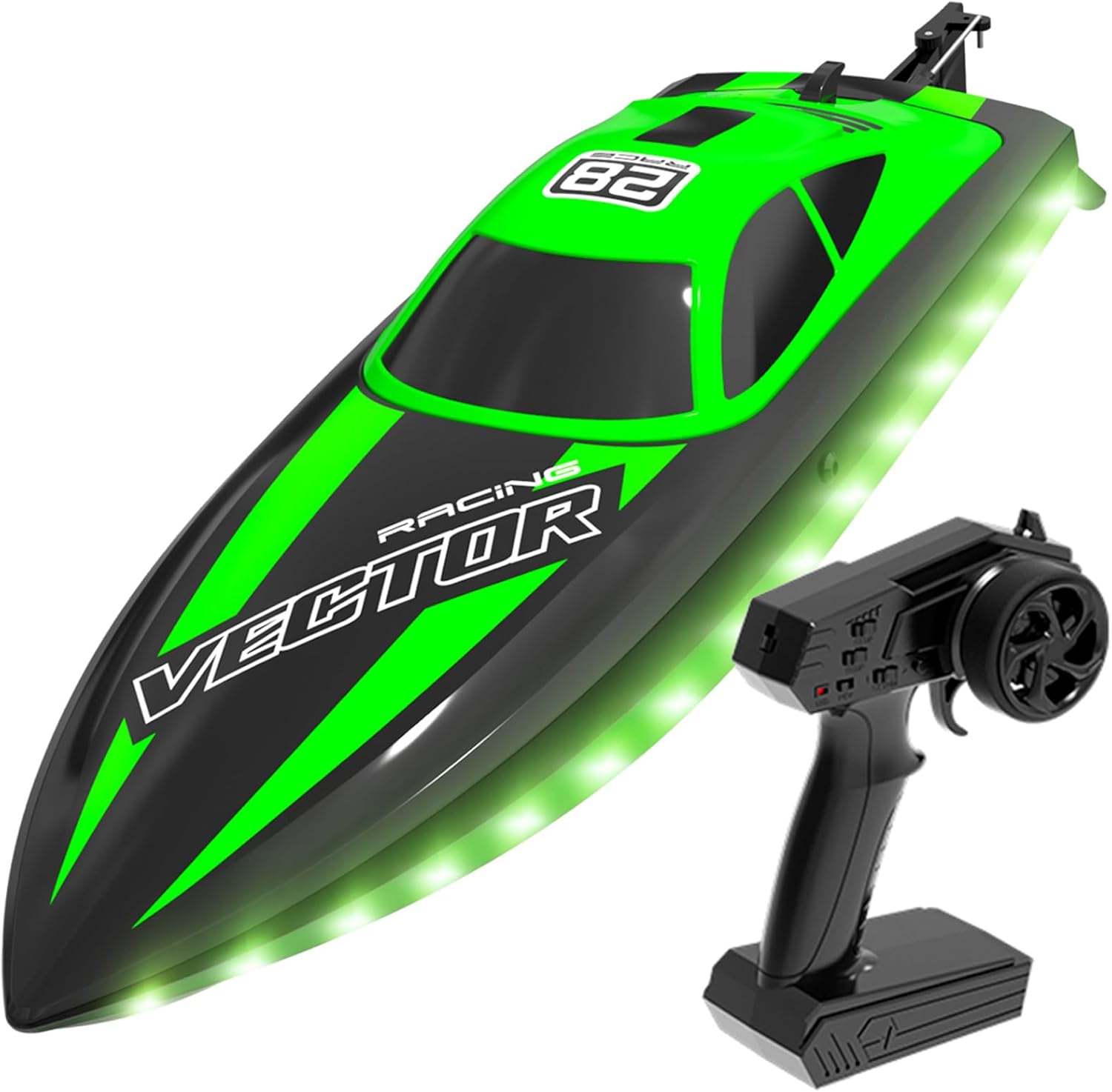 RC racing boats toy with LED lights and low battery alarm。The LED lights on the boat flash, allowing you to enjoy the fun of remote-controlled boating even at night. No need to worry about battery life; the controller will alert you when the boat’s battery is low.