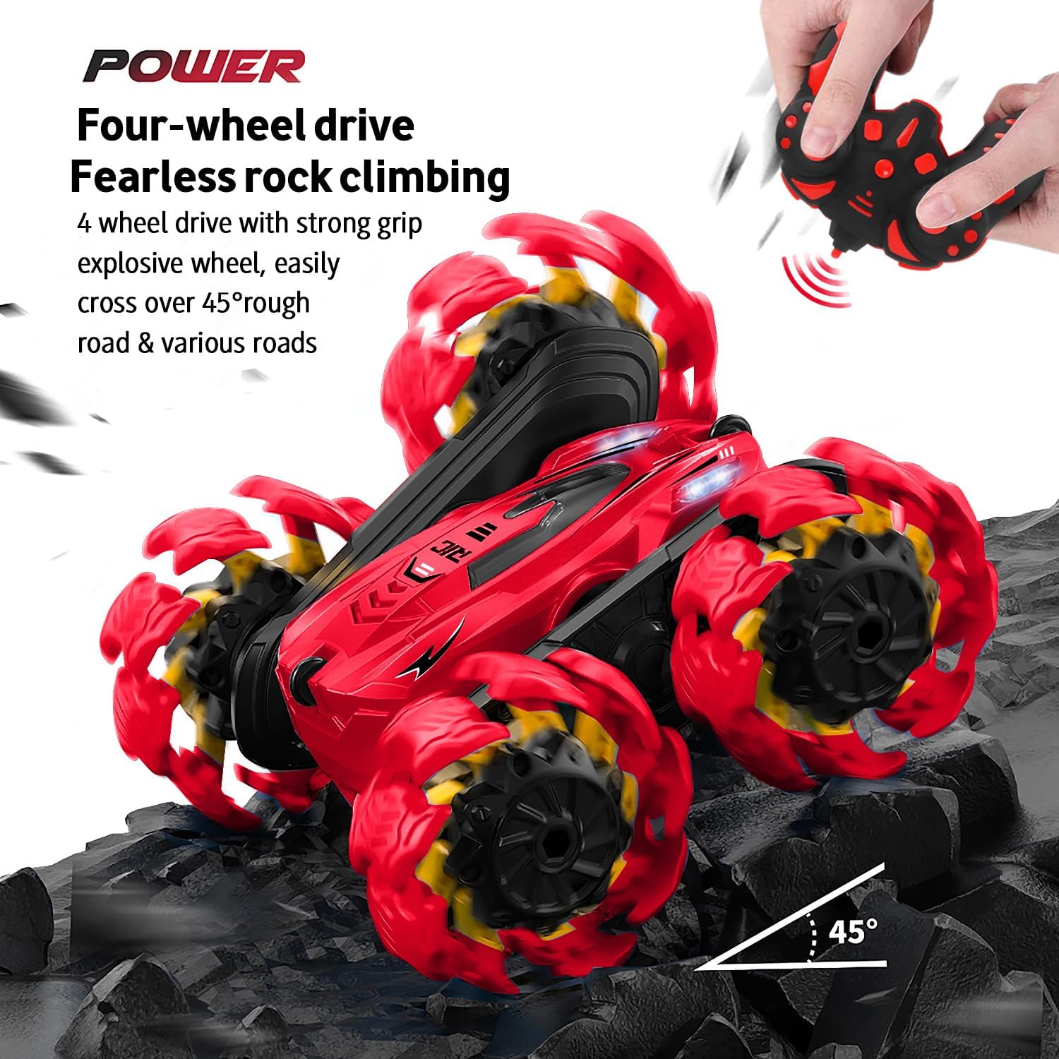 The Remote Control Car is the ultimate stunt toy for kids aged 6-12. This upgraded, double-sided RC car can rotate 360° and flip effortlessly, providing endless fun with impressive stunts. Equipped with LED headlights for cool nighttime play, it features 2.4GHz technology for smooth control and a strong 4WD system for high-speed action on any surface. Rechargeable and durable, this electric race car is built to withstand rough play. Perfect for both boys and girls, it makes an exciting gift for any young racing enthusiast.