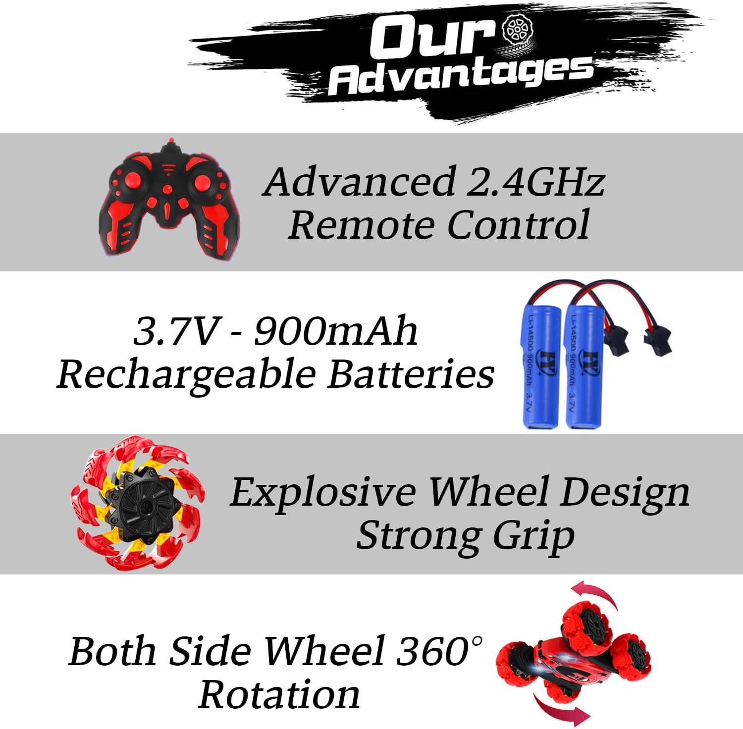 LONGER PLAYTIME WITH DUAL BATTERIES: Comes with two 3.7V 900mAh rechargeable batteries and a USB charger, offering up to 60 minutes of non-stop driving fun. Extended play means double the excitement!