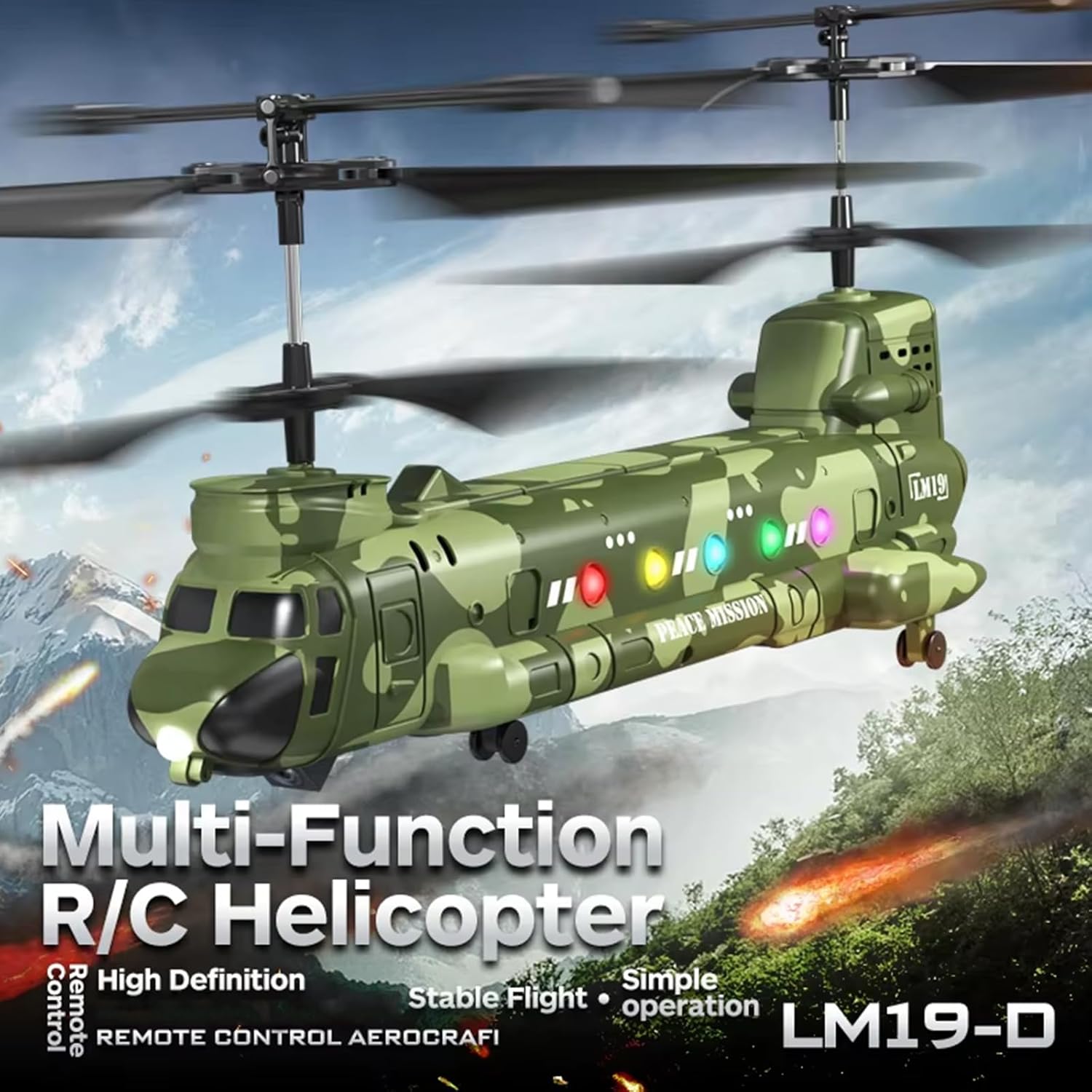 Military Transport RC Helicopters:Experience the thrill of real military flight with rc helicopters. Featuring a twin-propeller design and highly realistic details,this helicopter toy is guaranteed to catch attention among other toys. Primarily for indoor flying and sometimes for outdoor flying with a light wind. The perfect indoor flying toy is a must-have for RC helicopter lovers!