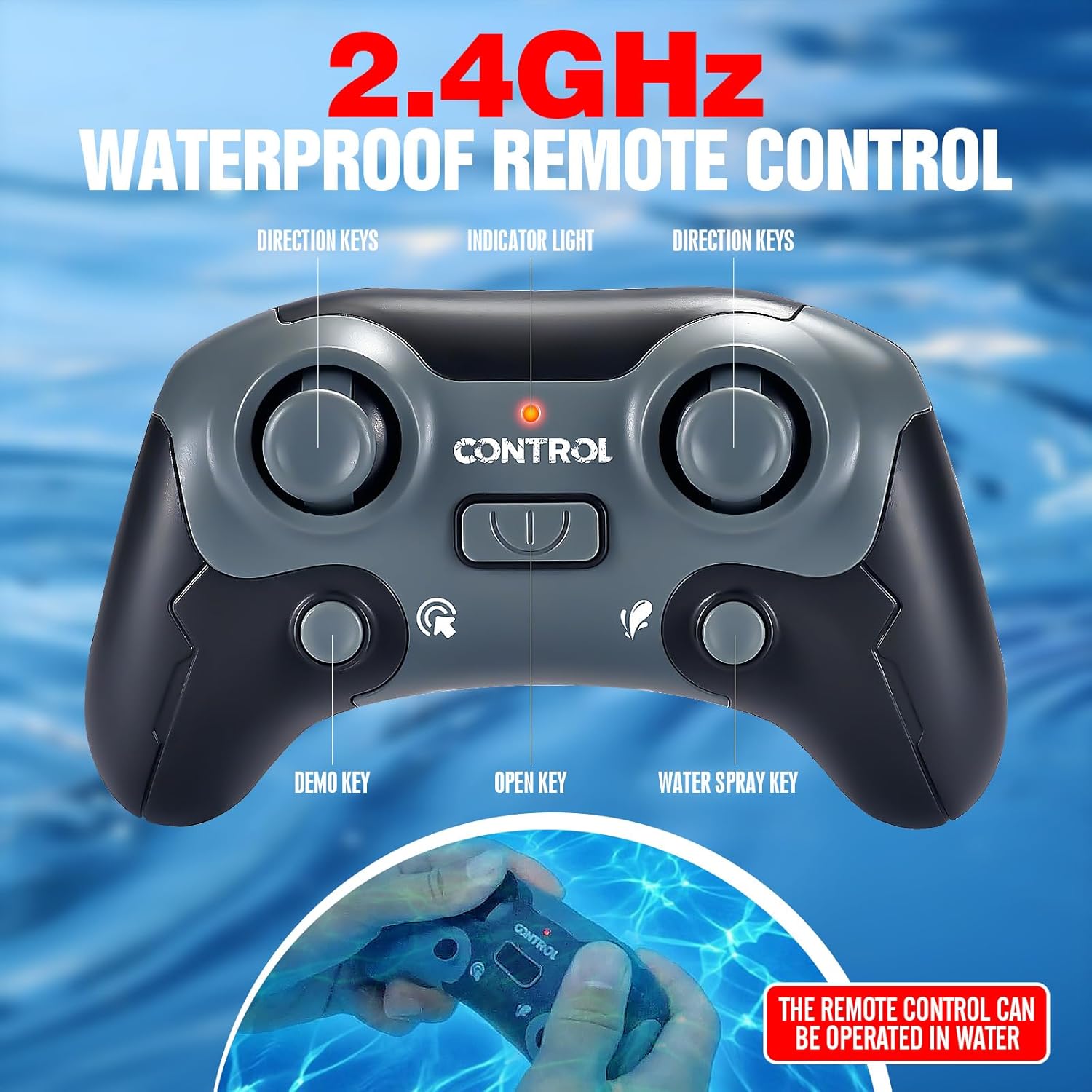 REMOTE CONTROL: 2.4GHz wireless controller enables precise swimming maneuvers and water spray feature activation from a distance