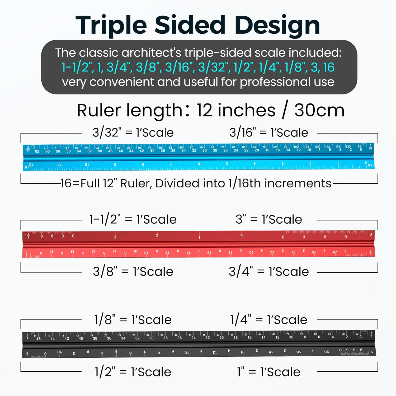 Triangular ruler features 3 sides with 6 different scales, and made from high Impact aluminum, build to last