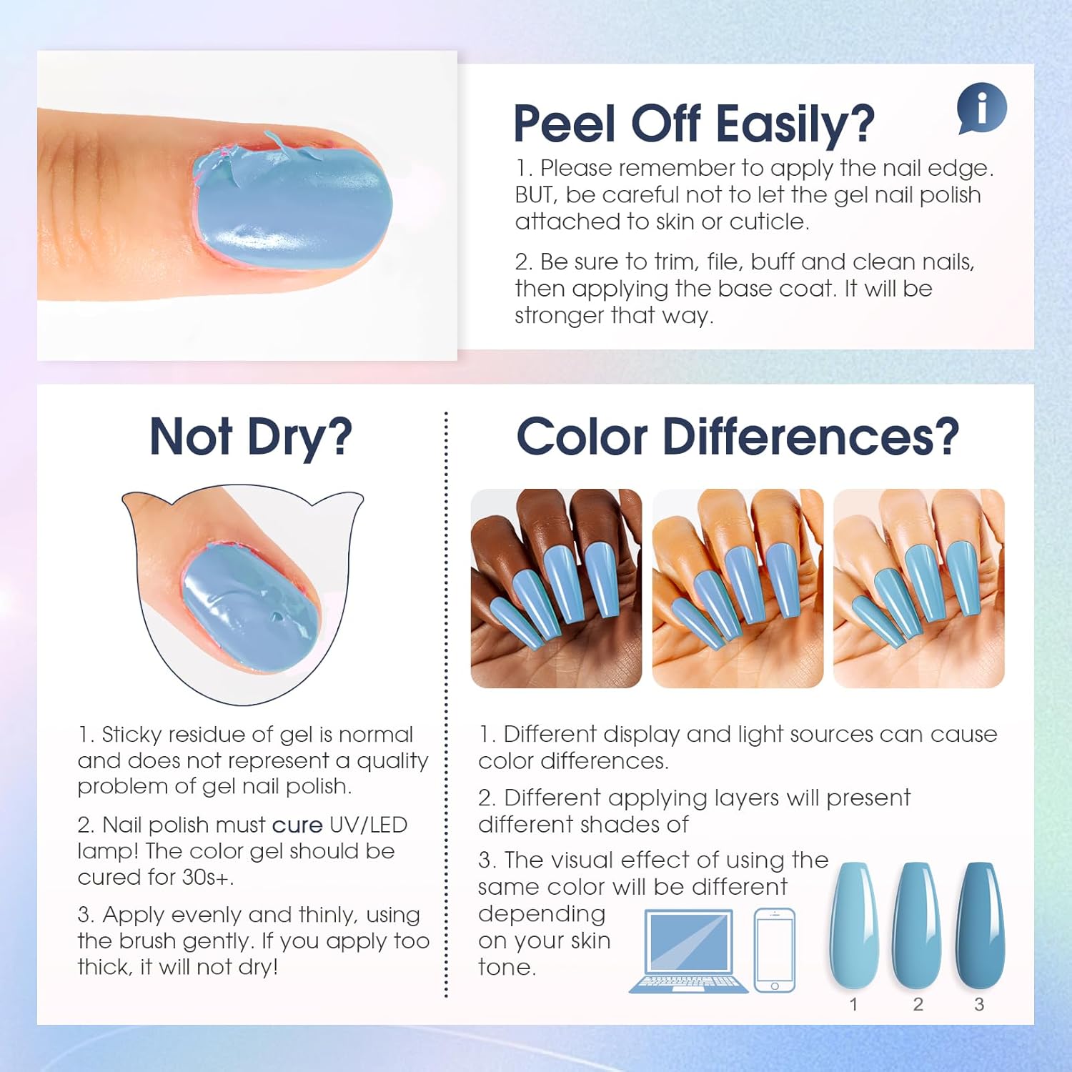 WARM TIPS: Buff your nail bed lightly before applying to prevent early peeling off. Dark colors(such as black) can appropriately extend the lighting time to 180 seconds. If you feel a burning sensation during curing, it is recommended to remove your hand from the lamp. Resume curing once the sensation returns to normal