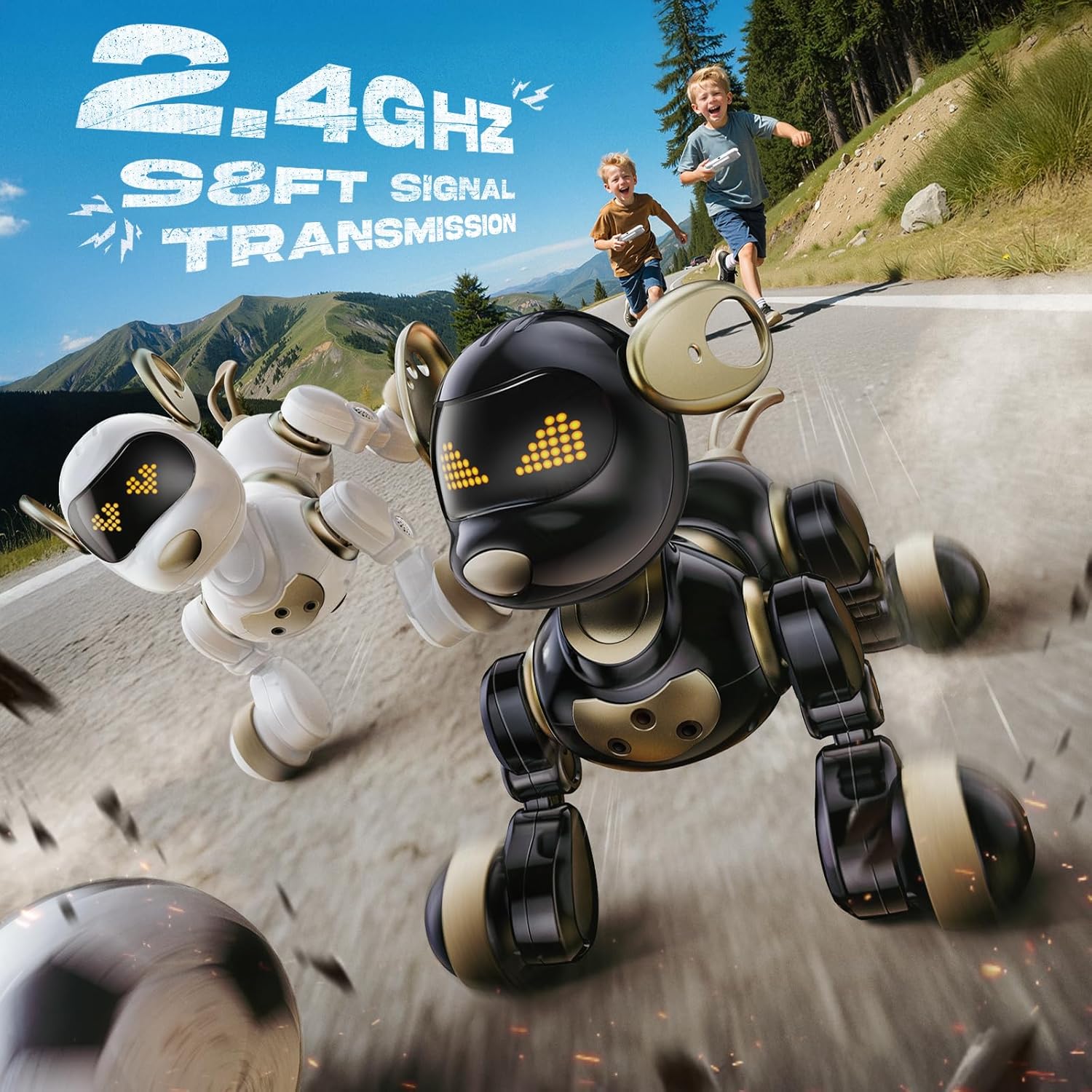 【Control the Fun, Your Way】Whether your child is across the room or right beside their pup, control is always at their fingertips! With a powerful 2.4GHz remote (up to 98ft!), they can direct their dog to walk, turn, bark, or perform tricks. Or, simply touch its head to activate fun sounds and gestures. Perfect for living room races or backyard adventures!