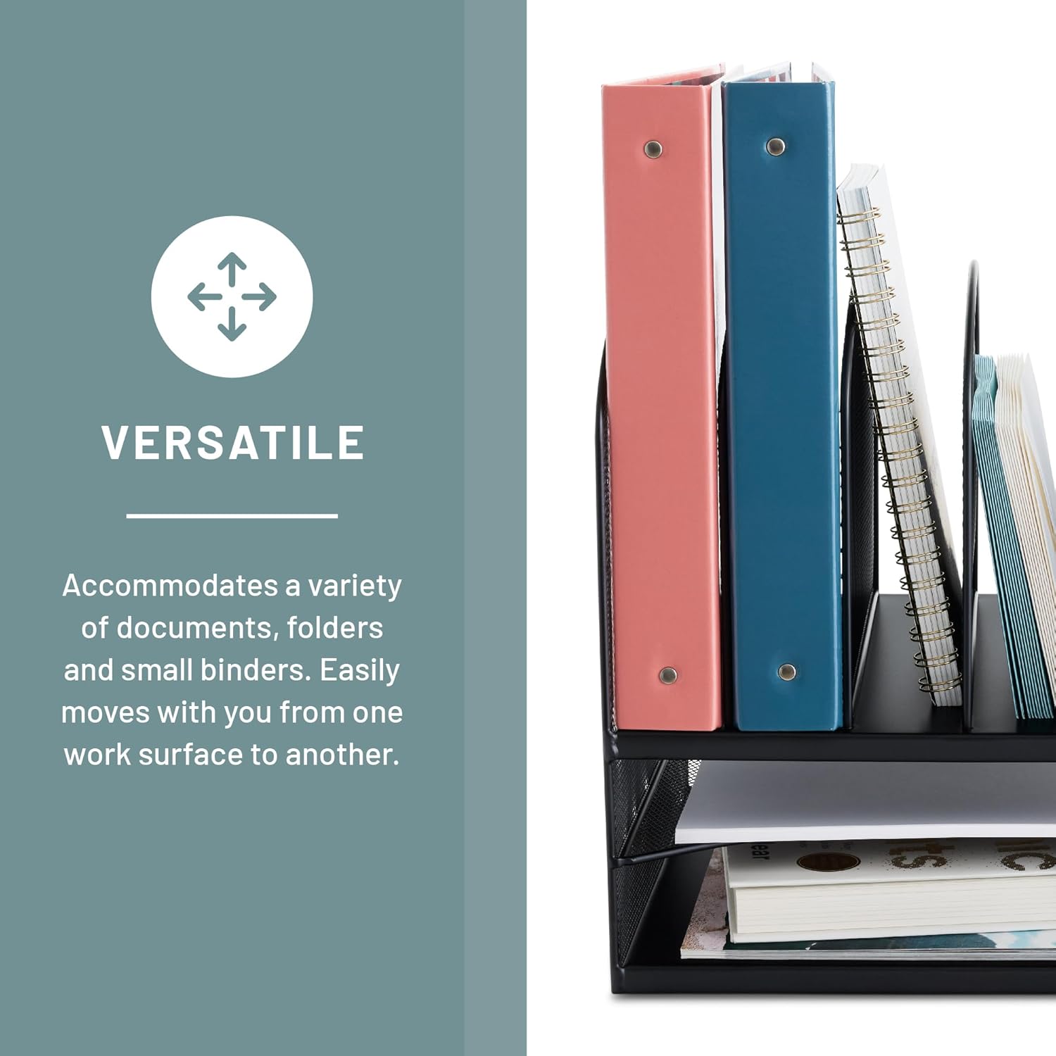 EFFICIENT ORGANIZATION. Six 2″ wide sections make easy work of desktop clutter by displaying important files and binders vertically for quick selection. Two horizontal trays conveniently hold mail, stacks of paper, catalogs, folders, and envelopes.