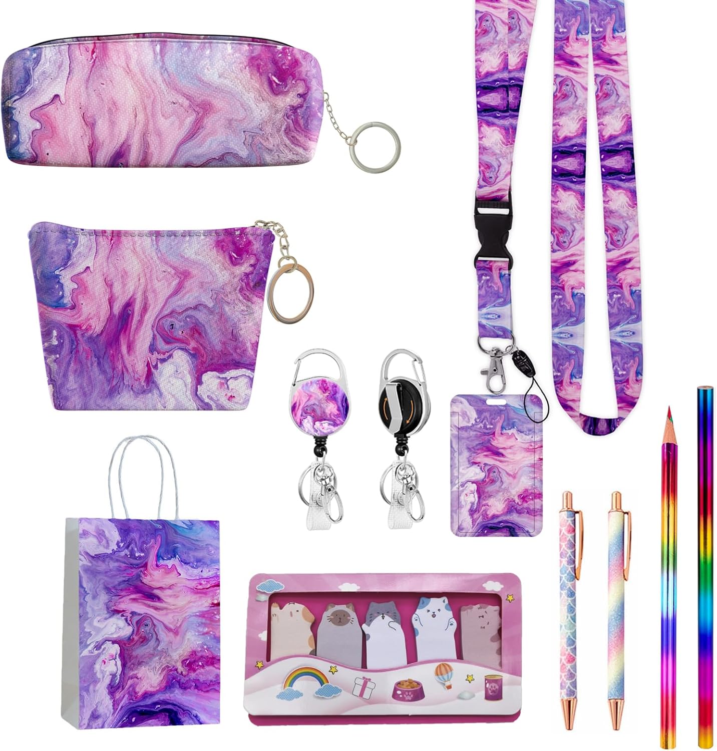 School Supplies Set Cute Stationery Gift ID Badge Holder with Lanyard Pencil Case Coin Purse Birthday Present for Student Teacher Colleague Nurse (Pretty Marble)
