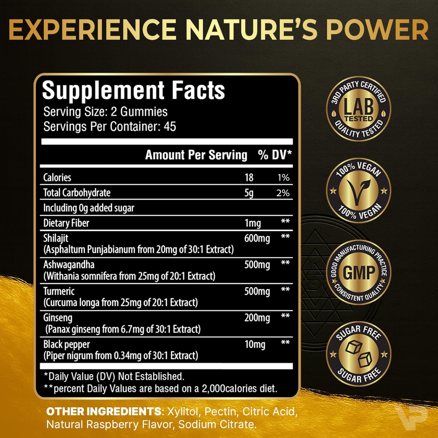 Shilajit Gummies – 5-in-1 Adaptogen Supplement with Ashwagandha, Ginseng, Turmeric, & Black Pepper | Energy, Focus, Immunity & Vitality Support | Organic, Vegan, Sugar-Free | 90 Count