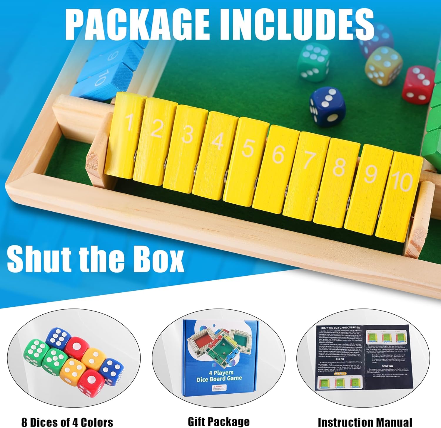 Package Includes: Lineba Shut the Box Game is one of the most popular math games. Package comes with 1 board box, 8 dices (2 per person), an instruction manual and a gift box. If there is any problem with the product, please feel free to contact us, we will solve it for you within 24 hours. Your satisfaction is our first goal