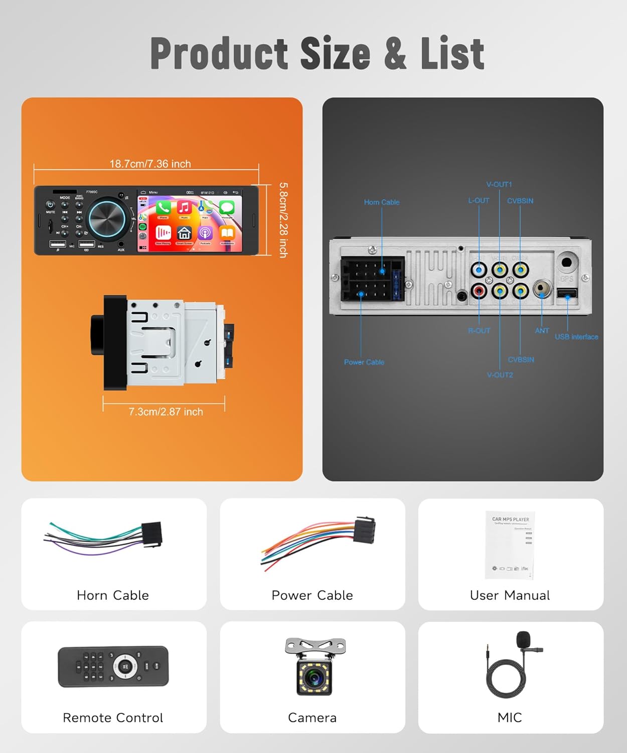 【Carplay & Android auto】Single din touch screen radio support Carplay and Android auto, You can choose wired connection to carplay/Android auto, connect to mobile phone, access mobile phone address book, mail, notification, map navigation, music, video and other information, and realize voice control.