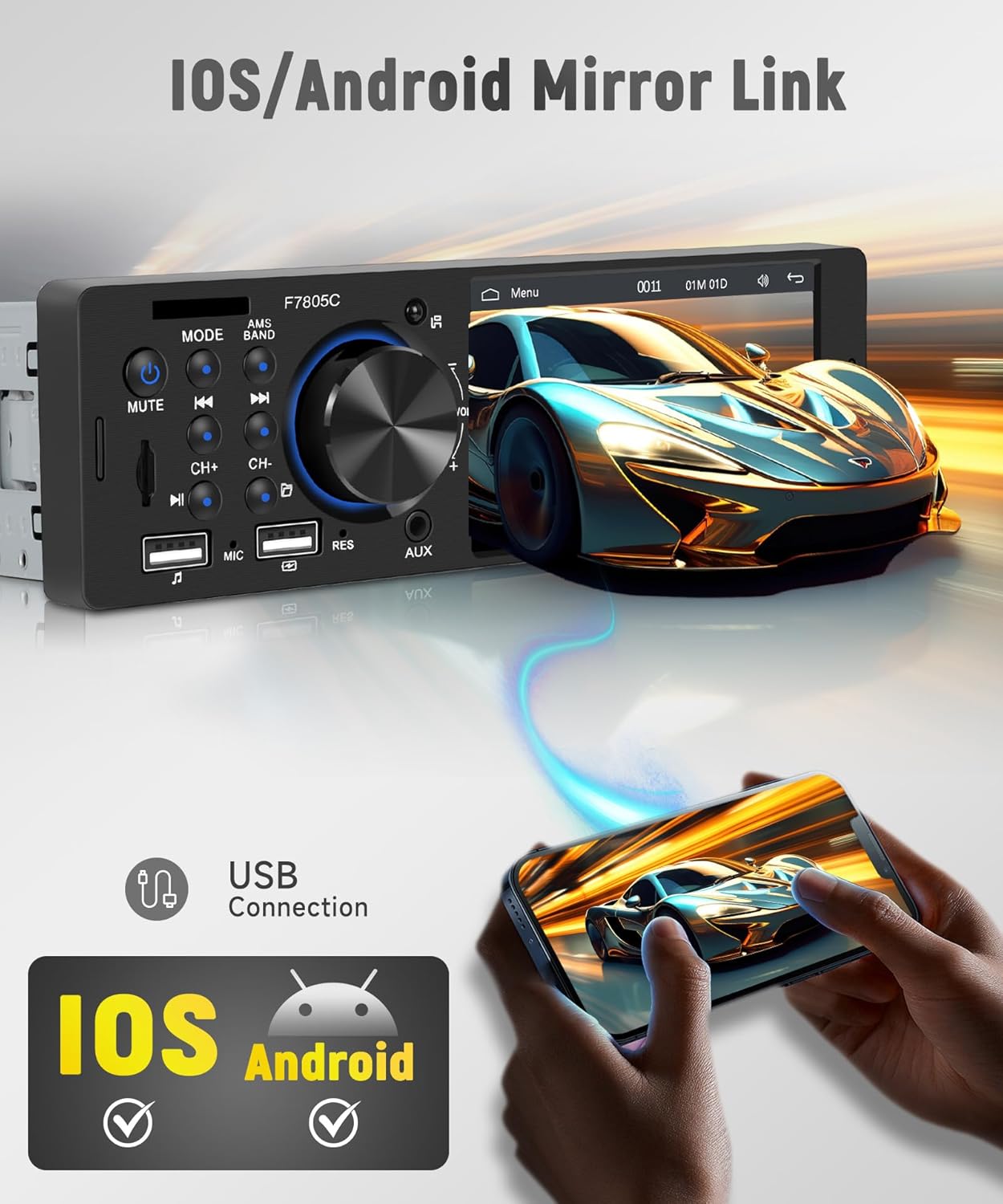 【Mirror Link for Android/iOS】Single din car stereo radio supports mirror link for Android and iOS phones, easy to sync your mobile phone via the USB to display on the car stereo screen, enjoy all your phone features such as navigation image, movies.