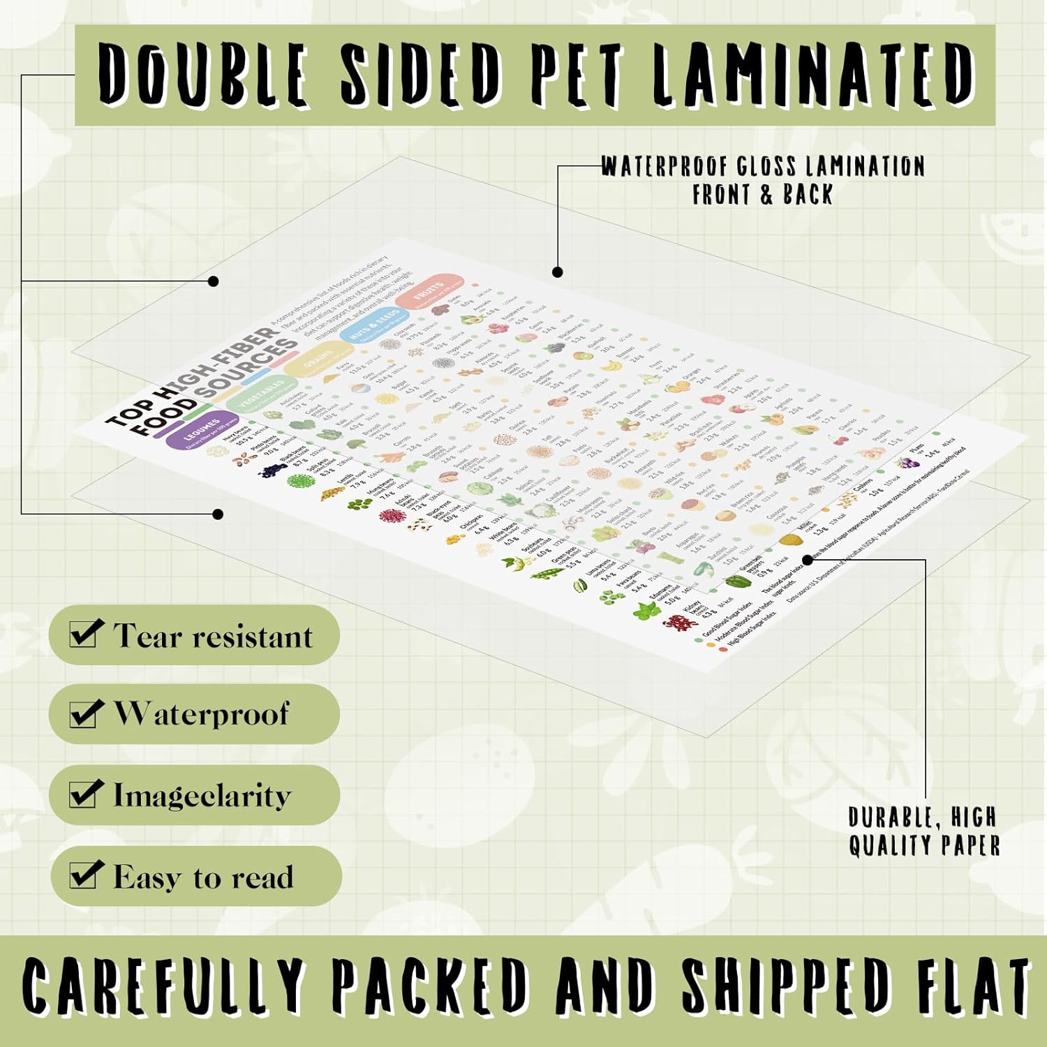 Functional Design: engineered with a double-sided lamination, our food list poster is fortified against water and stains, ensuring durability even in the kitchen environment