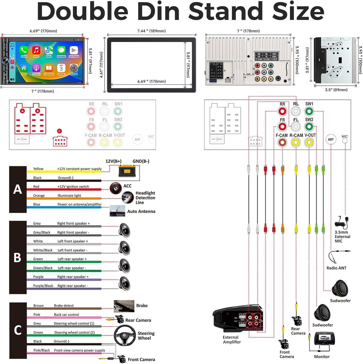 SJoyBring Double Din Car Stereo – Wireless Apple CarPlay & Android Auto, 240W 4.2CHN, 7″ Touchscreen, SWC, Bluetooth, FM/AM Car Radio, 2 Subwoofers Outputs, Backup Camera