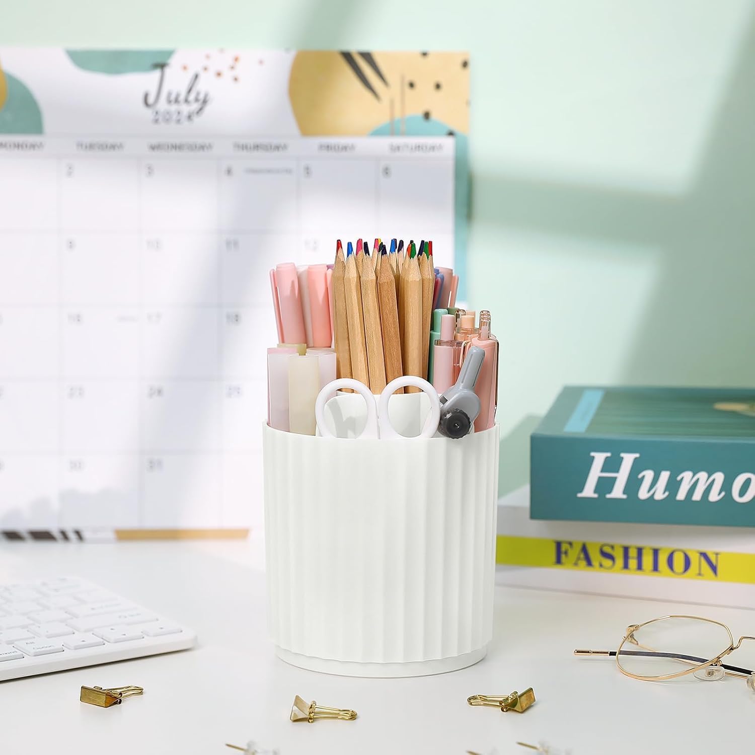 SKYDUE Rotating Pen Organizer – Small Desk Pen and Pencil Cup, Office and Classroom Use, White