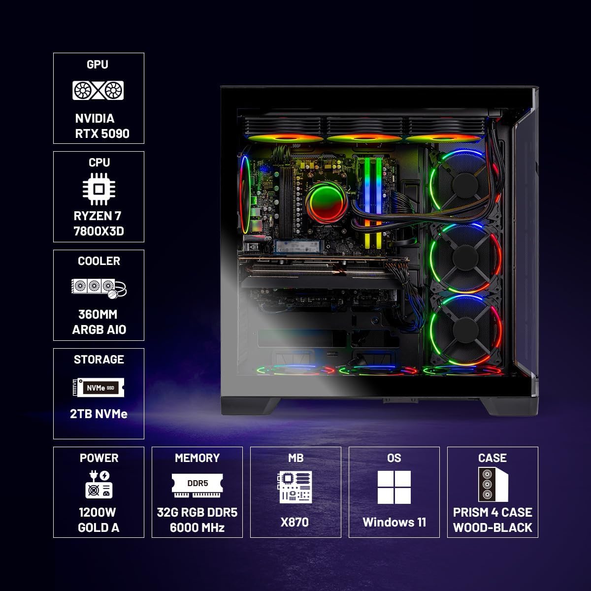 Skytech Prism 4 Gaming PC Desktop, Ryzen 7 7800X3D 4.2 GHz (5GHz Turbo), NVIDIA RTX 5090 32GB, X870 Board, 2TB Gen4 NVMe SSD, 32GB DDR5 RAM 6000 RGB, 1200W Gold ATX 3 PSU, Wi-Fi, Win 11