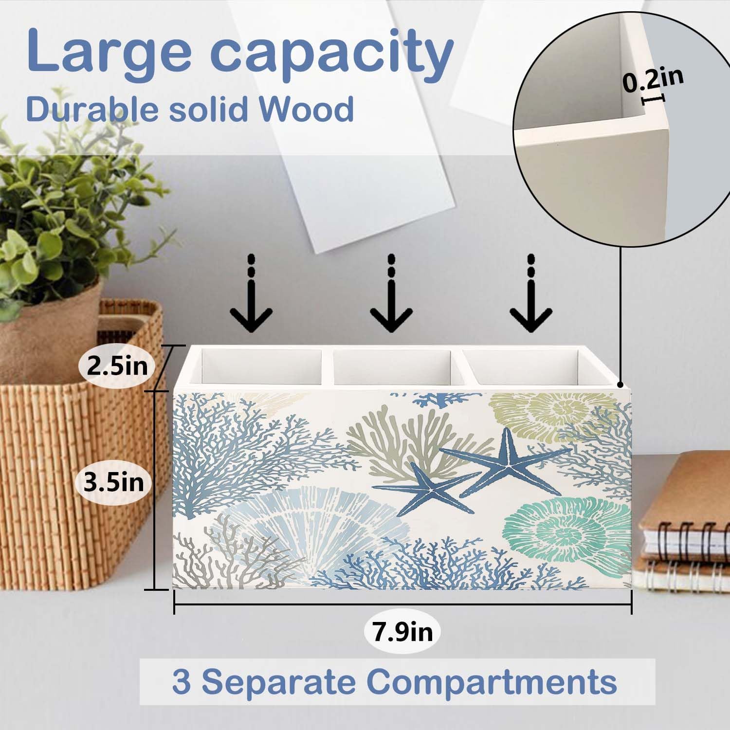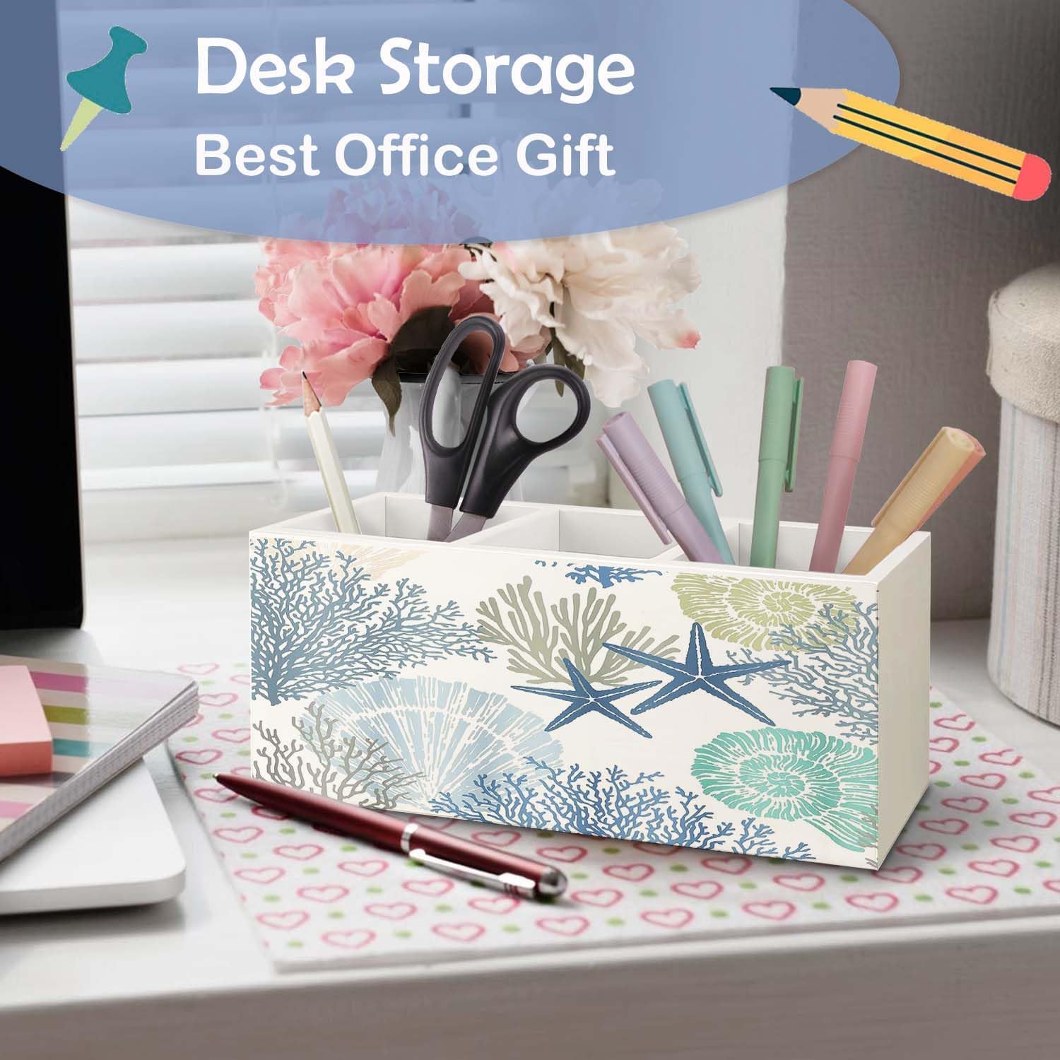 SNNDER Coastal Beach Pen Holder for Desk, Ocean Beach Lovers Gifts Wooden Box Sign Desk Decor for Home Office Tabletop Shelf Decoration, Coral Starfish Seashell Coastal Pencil Organizer